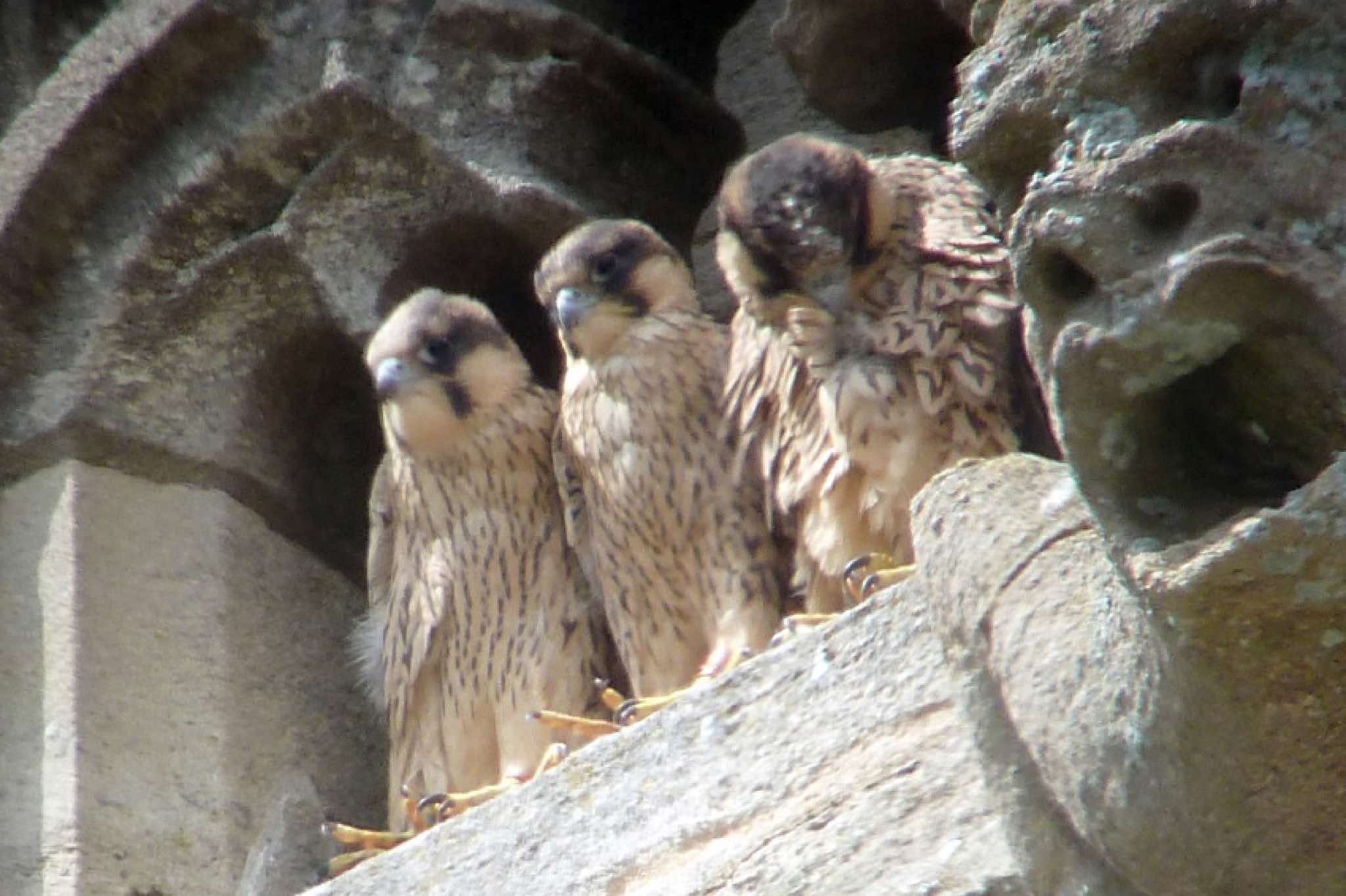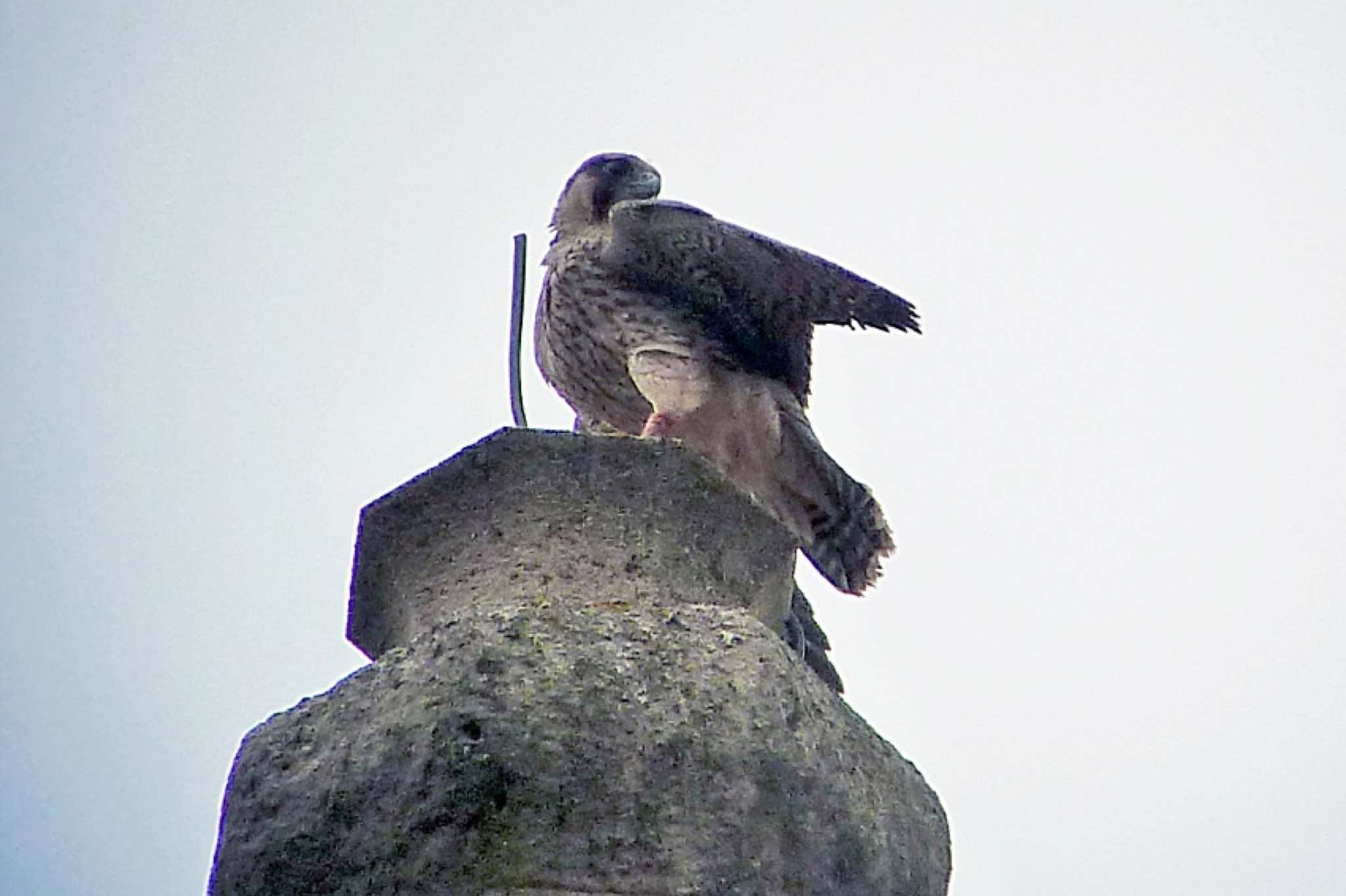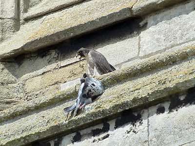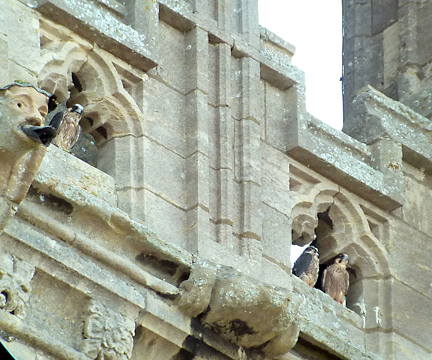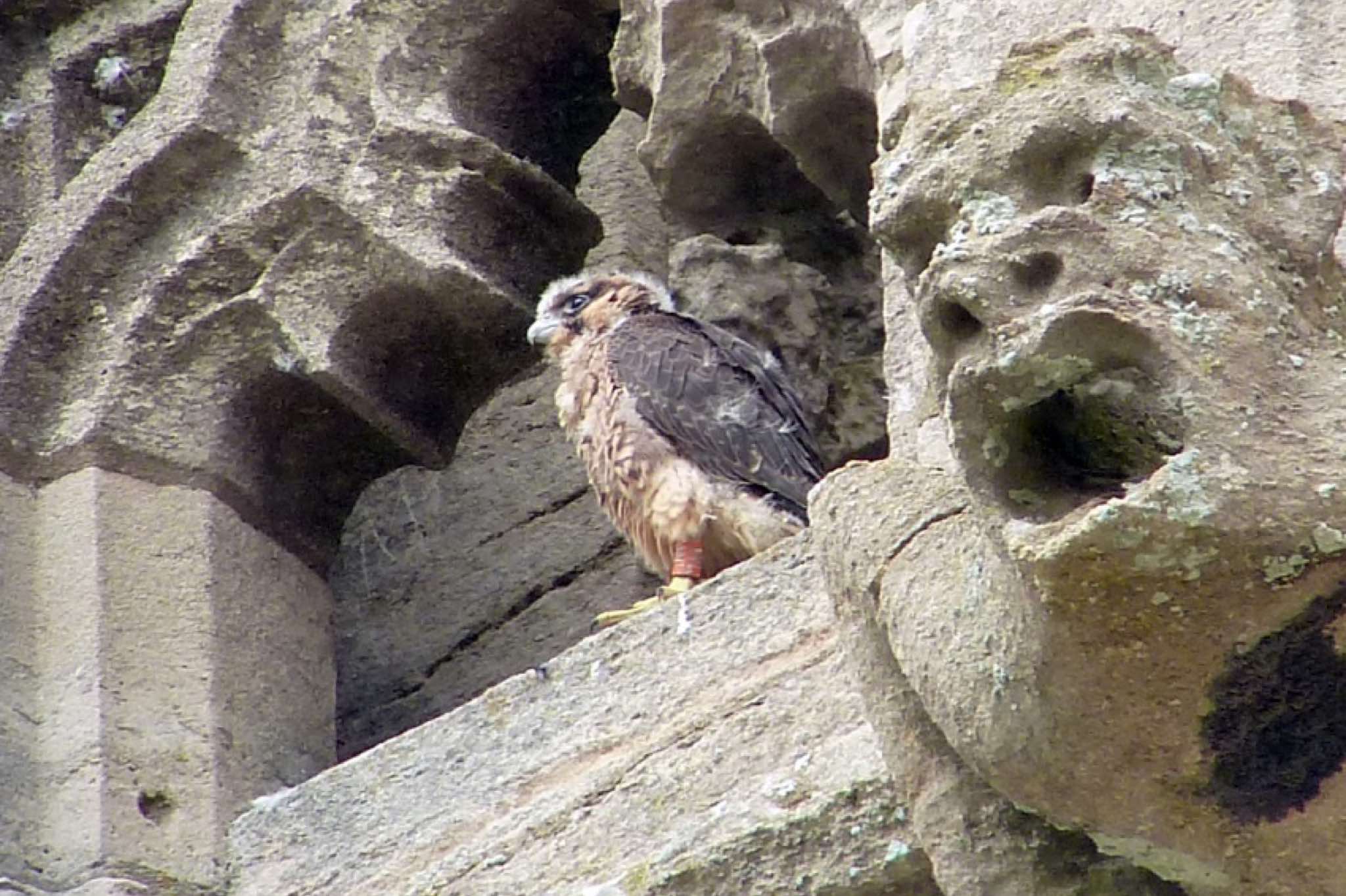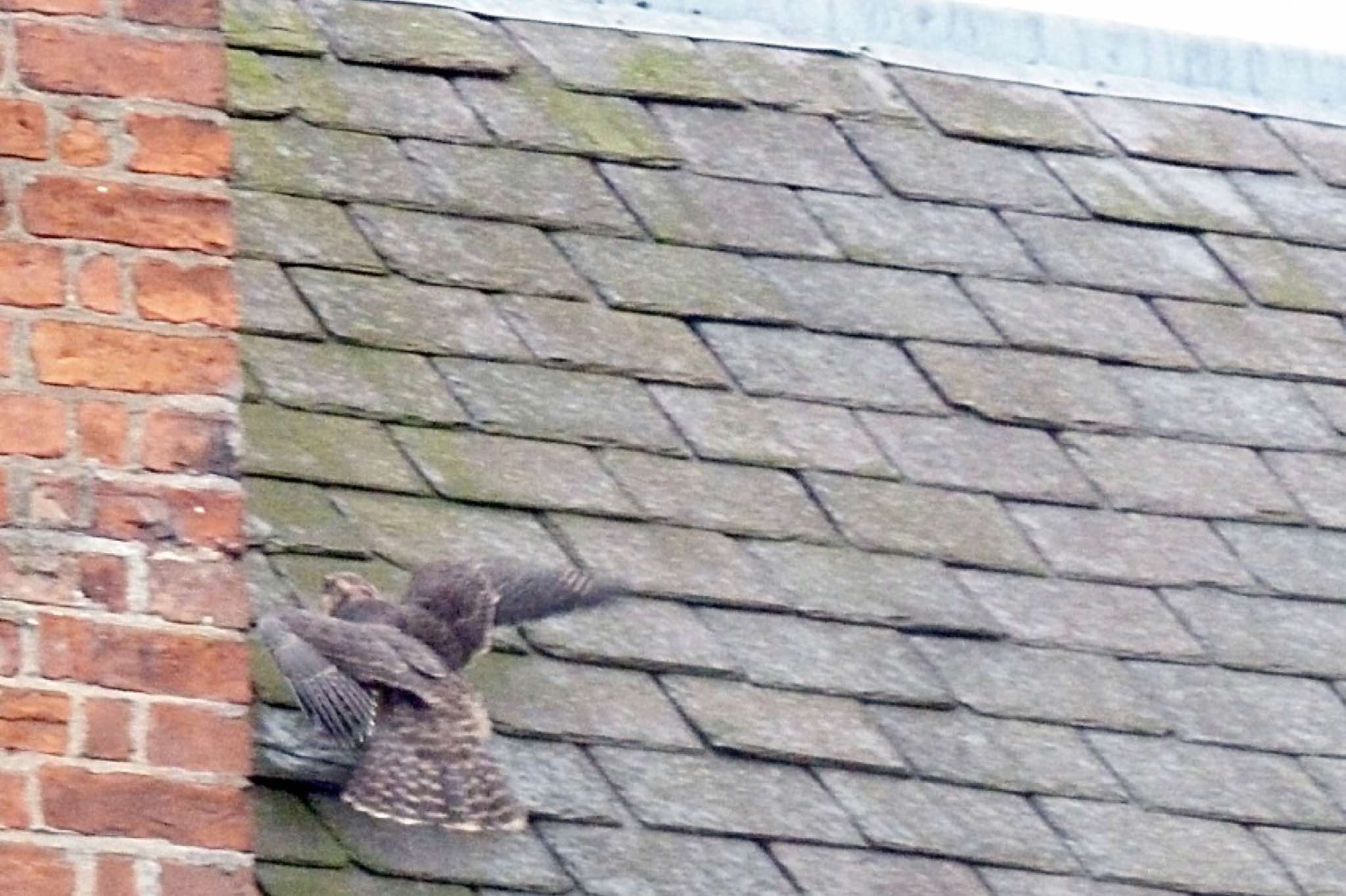 At this stage they become vulnerable to falling off on windy days. They rarely hurt themselves but the ground around the church is not a good place for a young peregrine. If seen, put on a pair of gloves, pick the bird up and put it in a box. Carry it up the tower, open the door to the walkway and tip it out of the box…’
