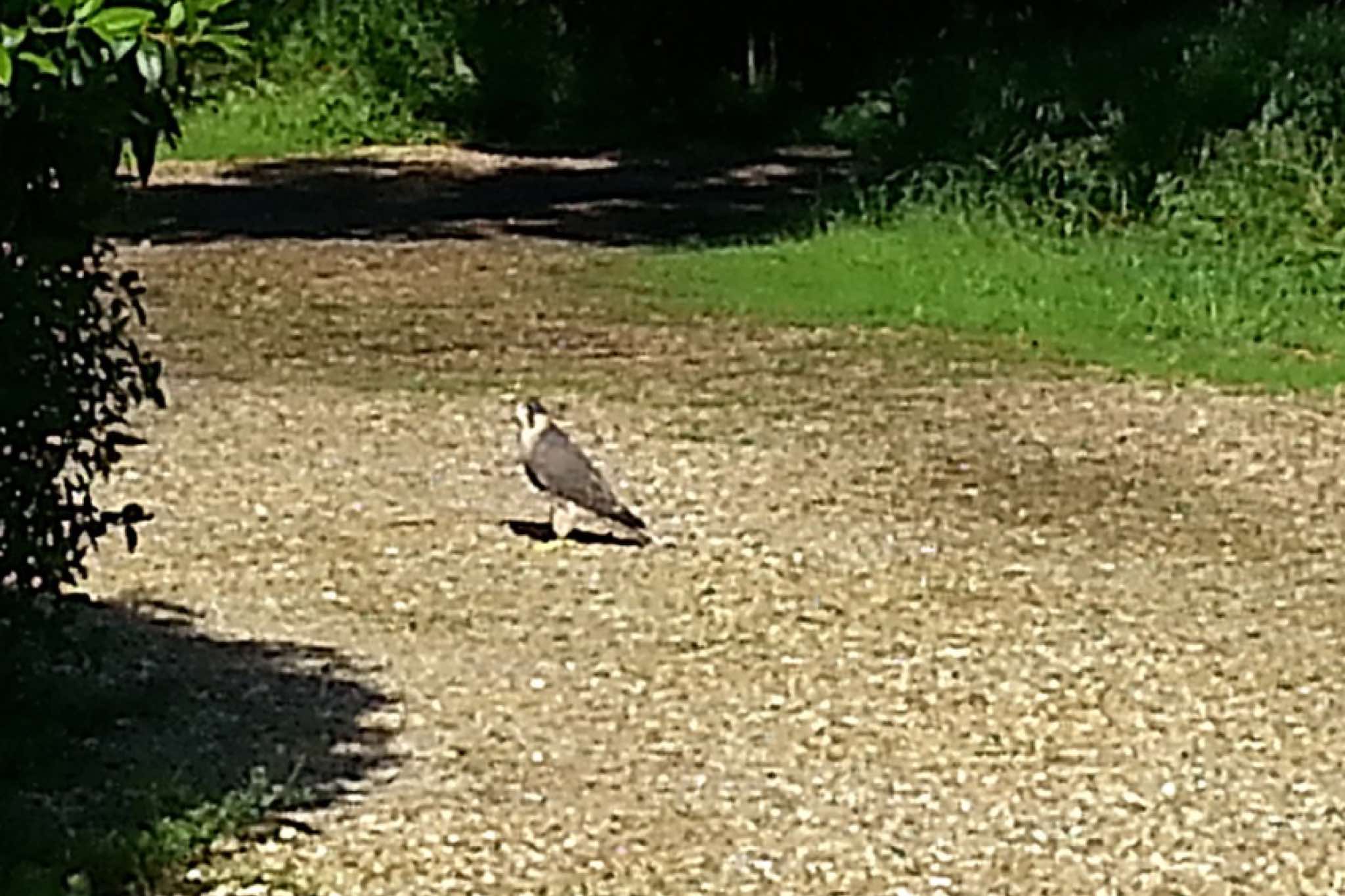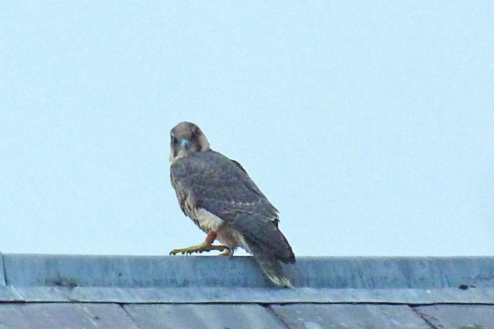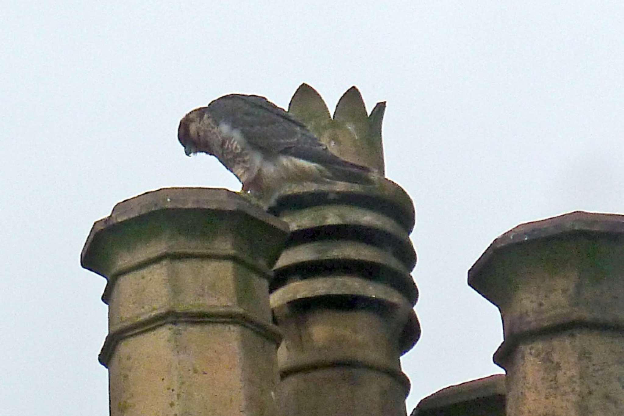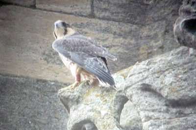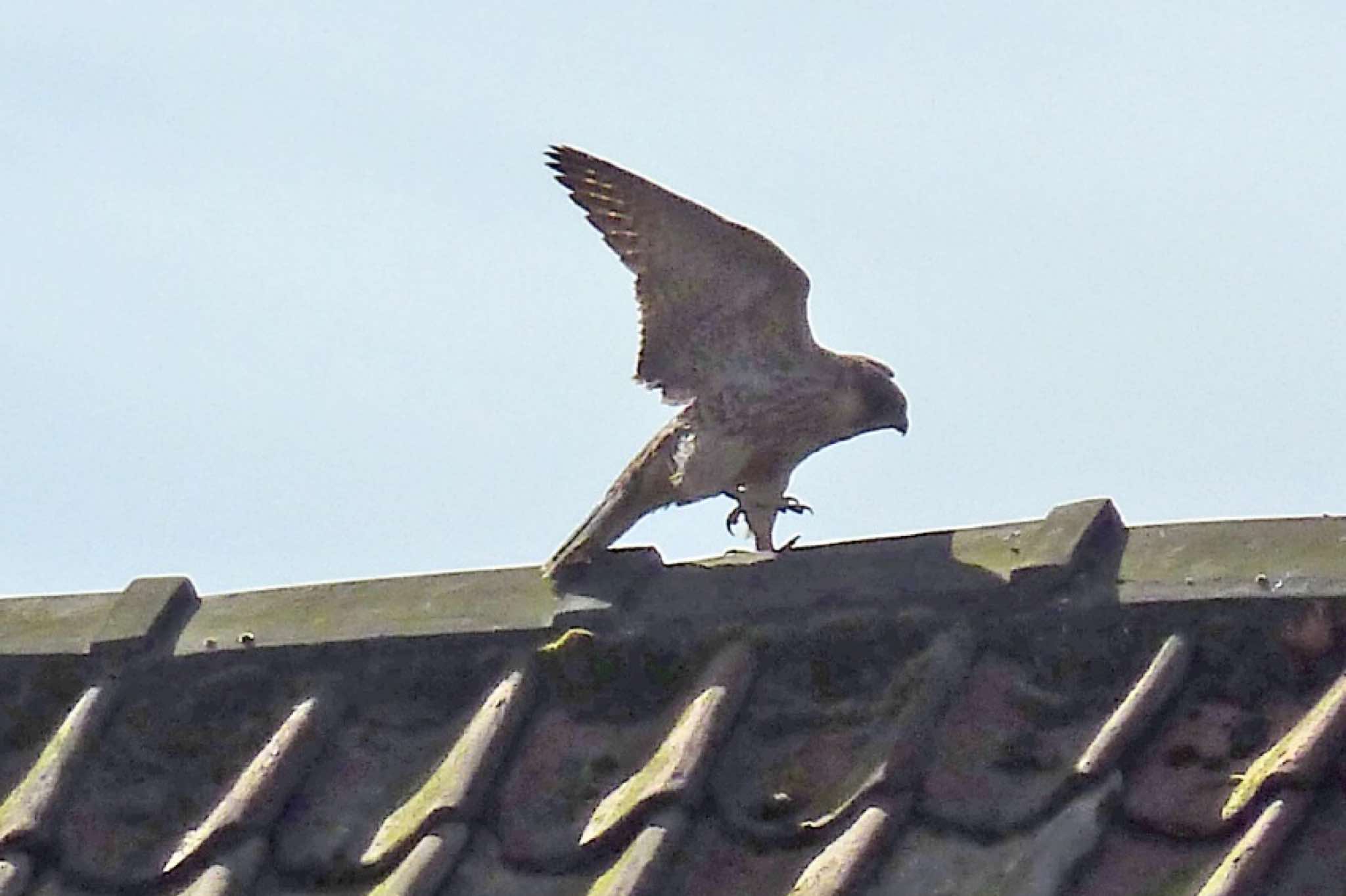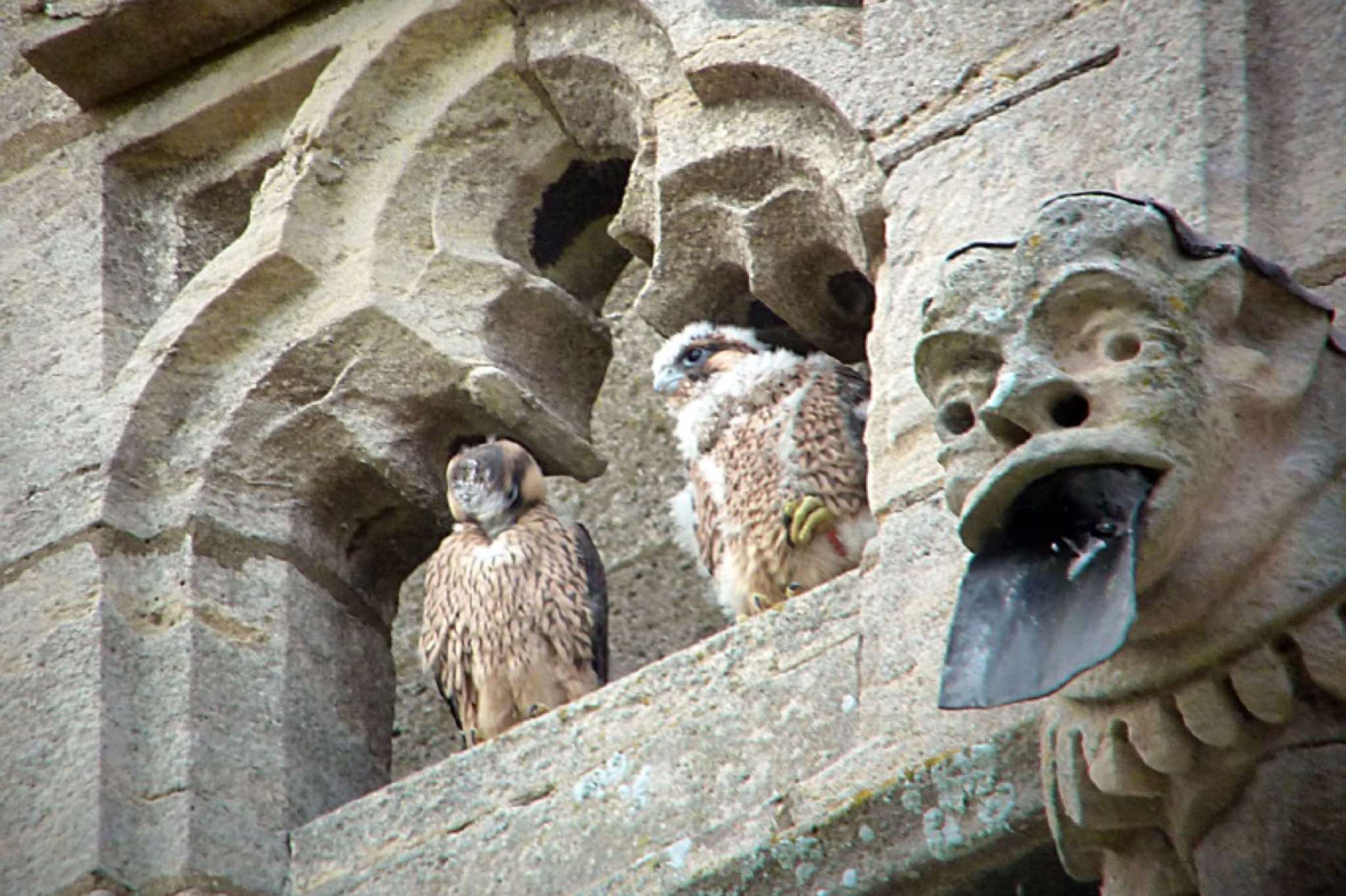 At this stage they become vulnerable to falling off on windy days. They rarely hurt themselves but the ground around the church is not a good place for a young peregrine. If seen, put on a pair of gloves, pick the bird up and put it in a box. Carry it up the tower, open the door to the walkway and tip it out of the box…’