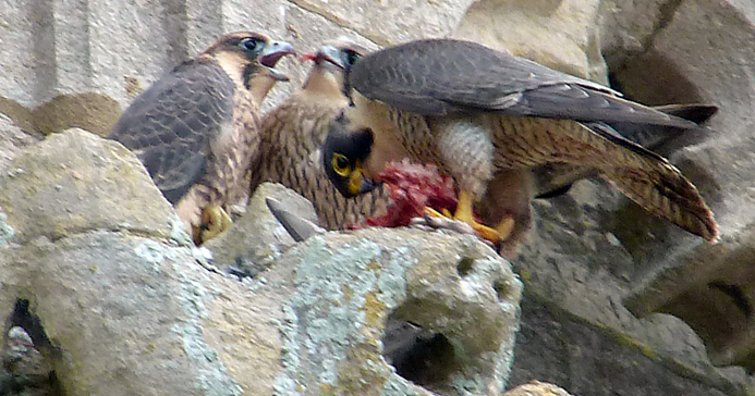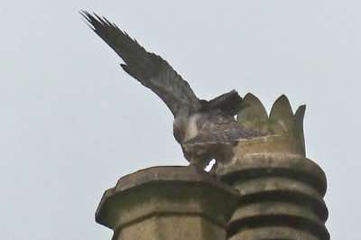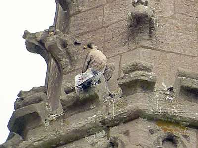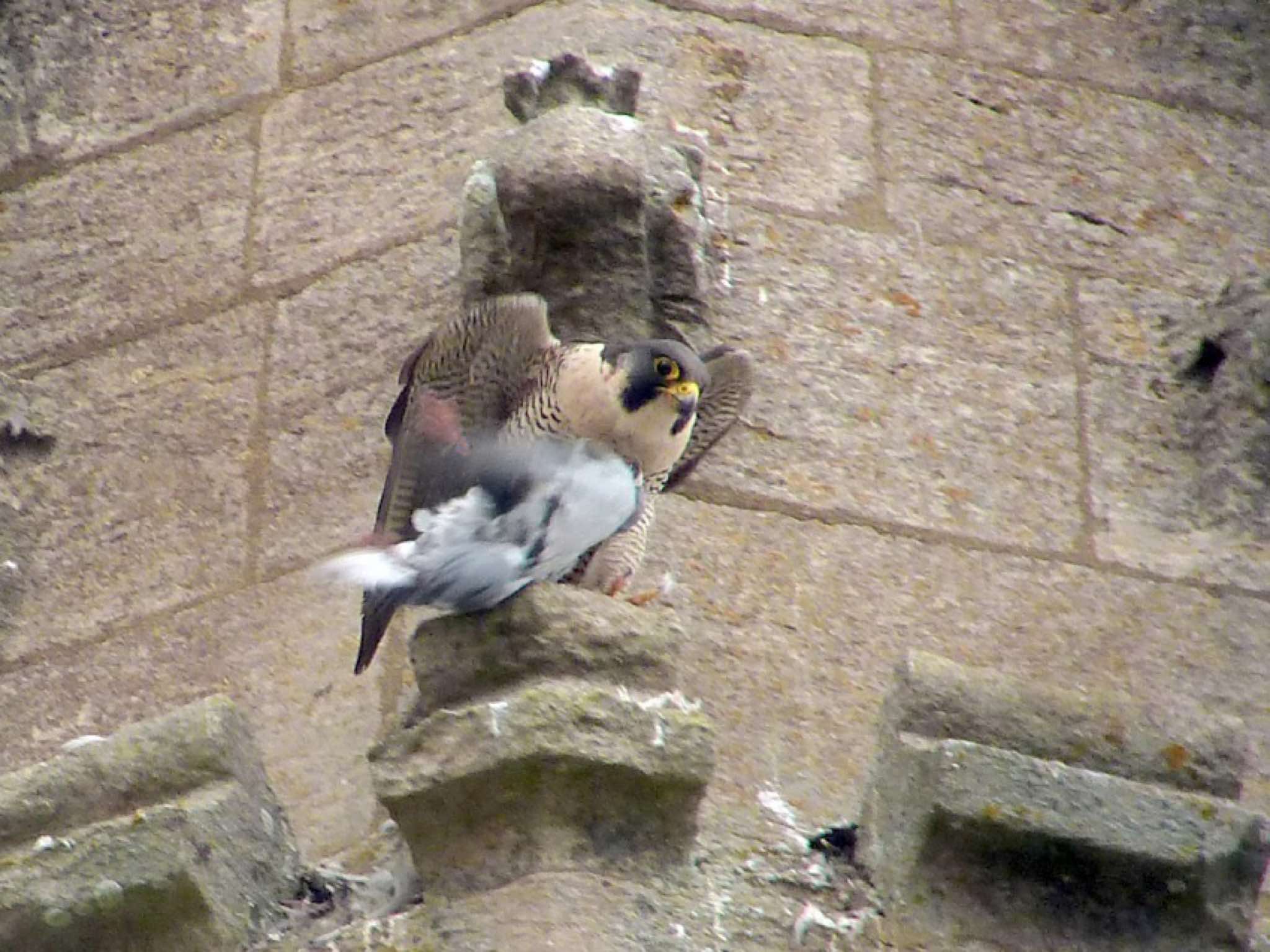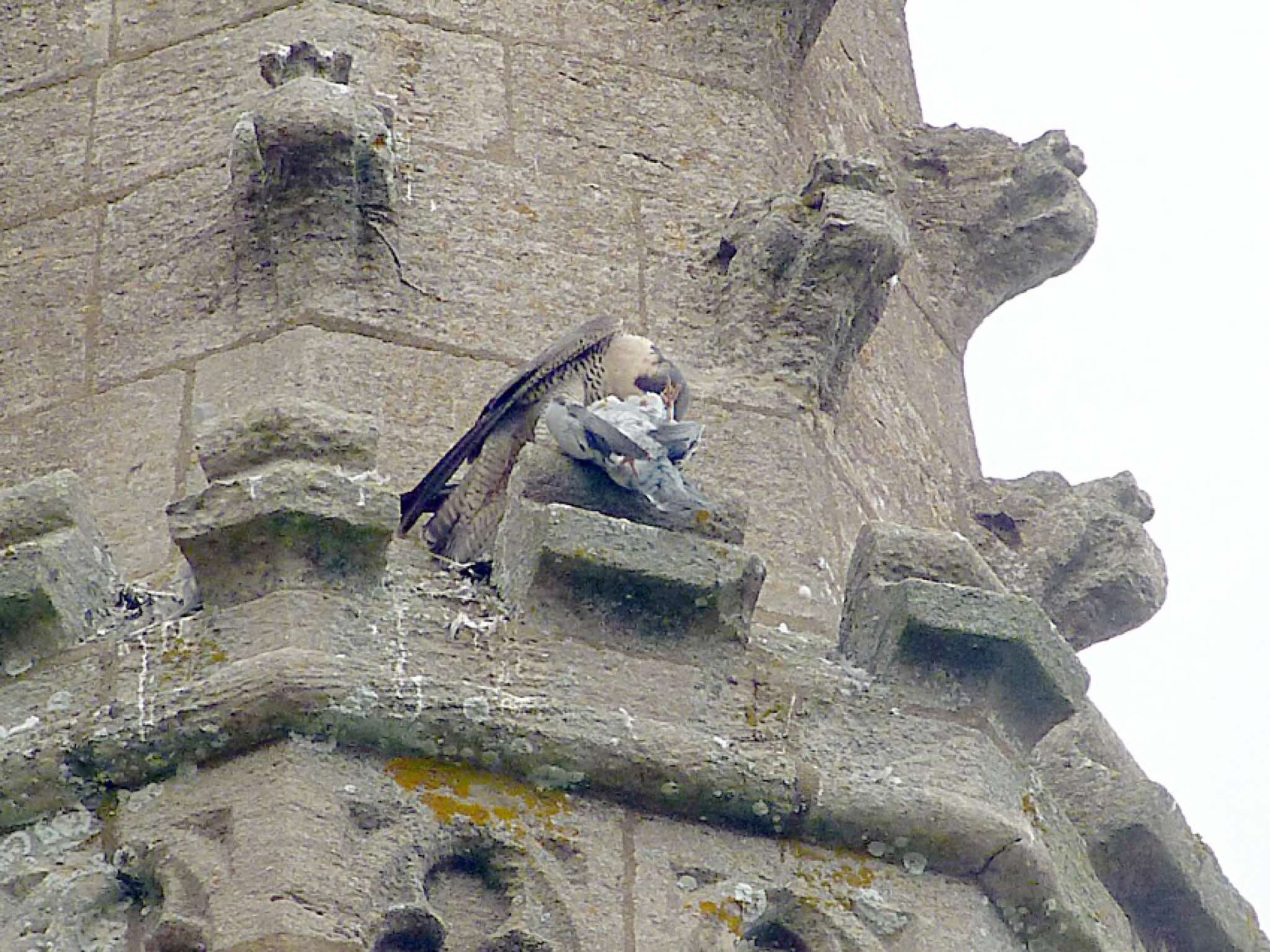 There was some spectacular action that day; in the morning, the male stooped from a great height to attack a curious carrion crow and chased it off, then at 16.00 there was a very noisy food exchange when the male brought in a pigeon. The female flew from the nest to collect it, and could be clearly seen perched on the spire, gorging herself.