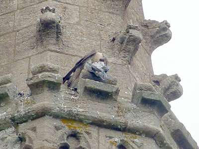 Throughout February and March, sightings of the pair increased to the point where we thought the birds were attempting to nest. On 25 March at 07.50, the male flew from the southeast onto the castellations on the east side of the tower and dropped directly down onto the walkway. An hour later the second peregrine arrived, flying in from the east. It alighted on the south face of the tower and drop down onto the walkway there, presumably walking round to its mate.