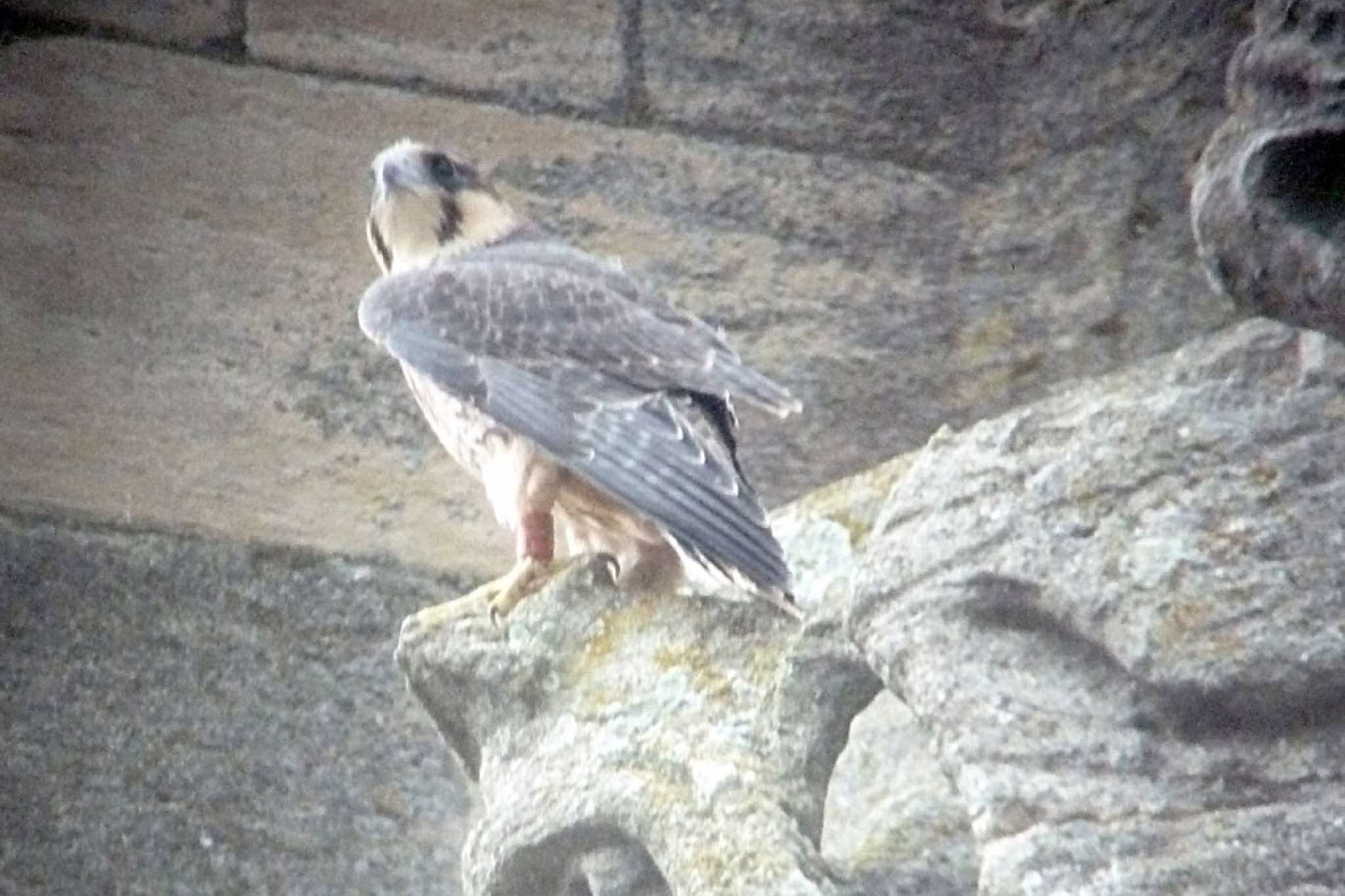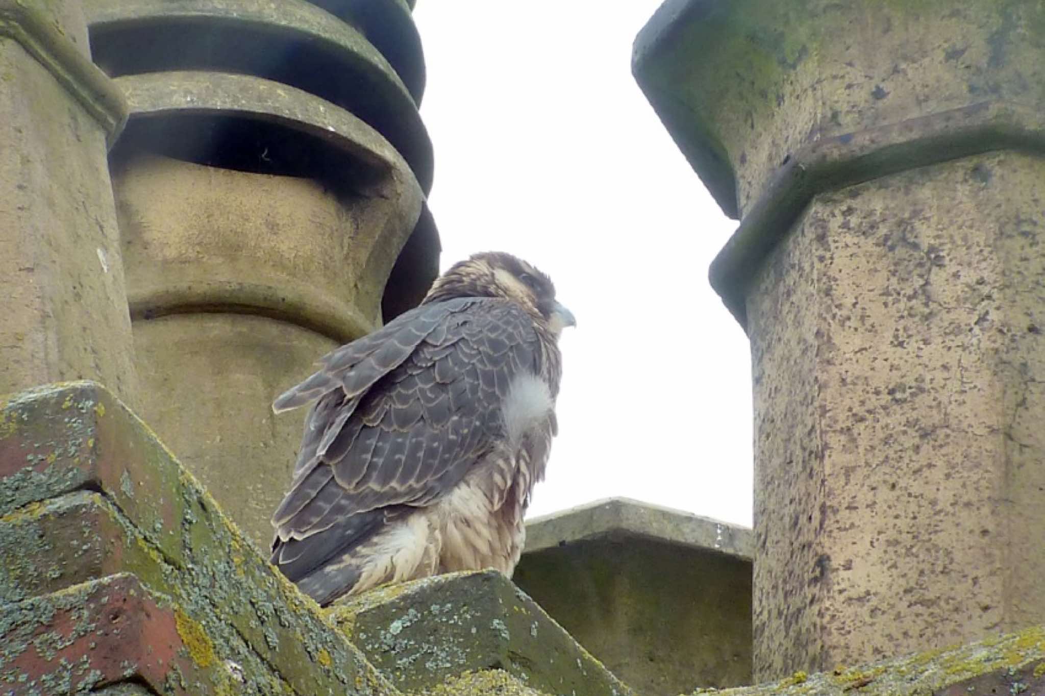 By the third week of June, viewers of the TV screen could clearly see the juvenile plumage showing through the fluffy white down and a week later the transformation was complete. Around this time, sighting on the TV screen became a rarity as the juveniles went ‘walkabout’ around the tower walkway, then on 30 June a juvenile was seen looking through the castellations on the tower; I got my gloves and box ready!