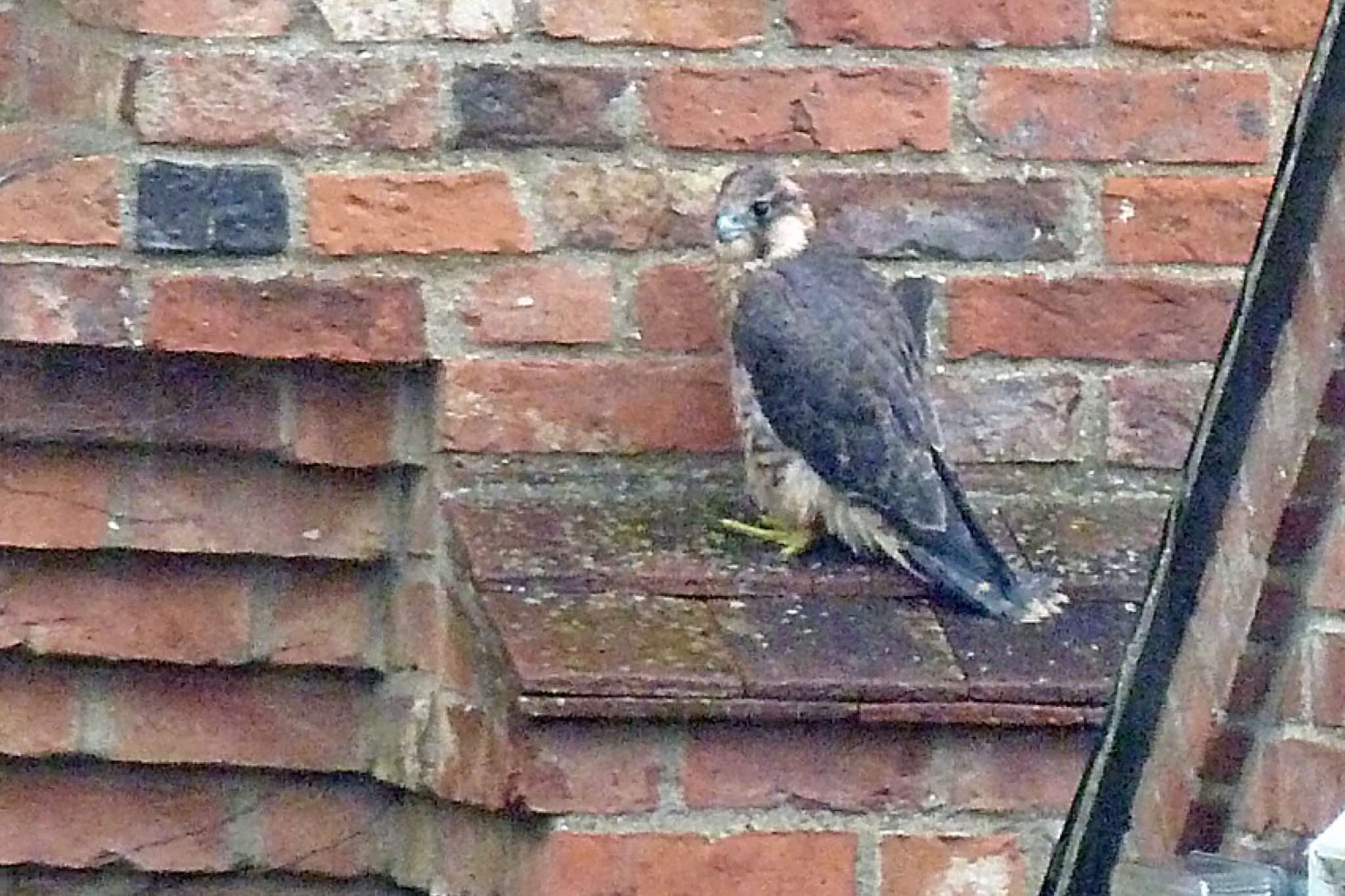 I was away from home on 11 July when I had a call to say there was a juvenile sitting on a car bonnet in Westgate. I hurried home to see a very unhappy youngster perched on the church’s perimeter wall by the traffic lights. It had already been caught once by John Clarkson, who tried ‘launching’ it, but it only flew for about 50 metres before encountering a brick wall, where it managed to cling to the vertical surface for a short time before dropping down to this lower wall. It was clear the bird couldn’t be left in this situation, so John and I tried to catch it again with a view to taking it back up the tower, but we were unsuccessful, and instead, the bird flew at an alarmingly low height along Bridge Street, crash-landing on the roof of the Old Mill House and sliding down to the guttering where it remained. It was some time until the three juveniles were seen together again.