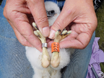 With the ringers enjoying their tea and cake in the coffee shop, we learned that the three juveniles were all males, weighing 580g, 630g and 715g. Each chick now had two rings, a metal BTO (British Trust for Ornithology) ring on its right leg bearing a unique number, and a large orange plastic ring on its left leg with a black letter and number that can be read from a long distance with a telescope. Orange is the colour used for peregrines in the East Midlands, and so together with the identification number – our birds are W3, W6 and W9 – they can be individually recognised.
