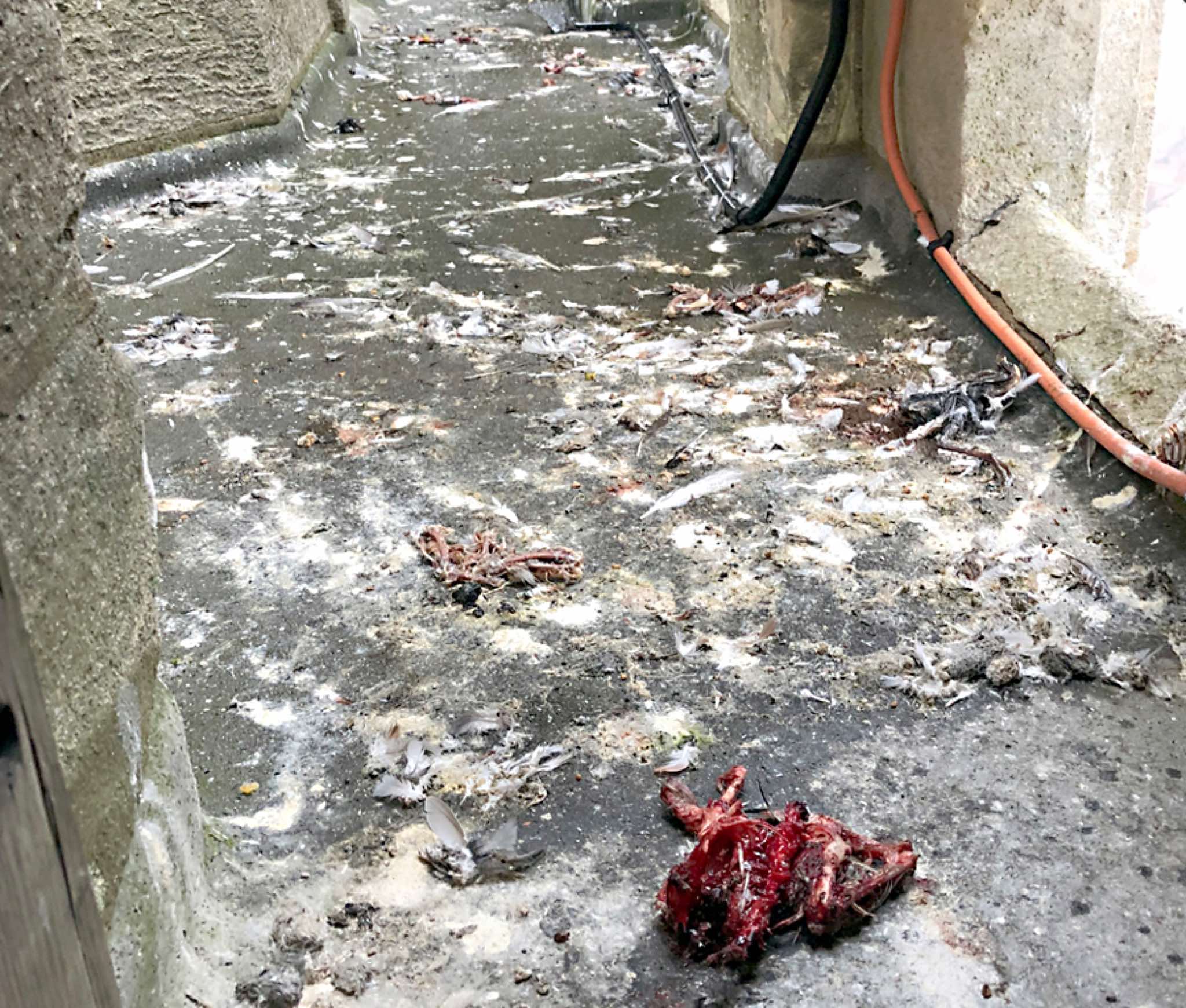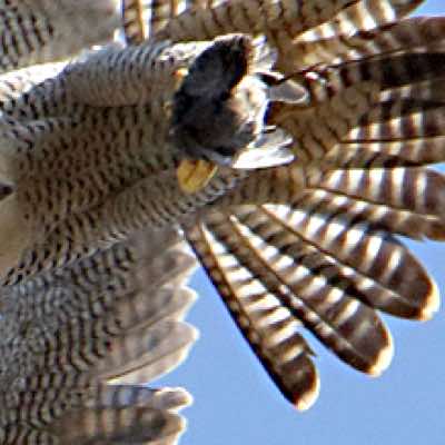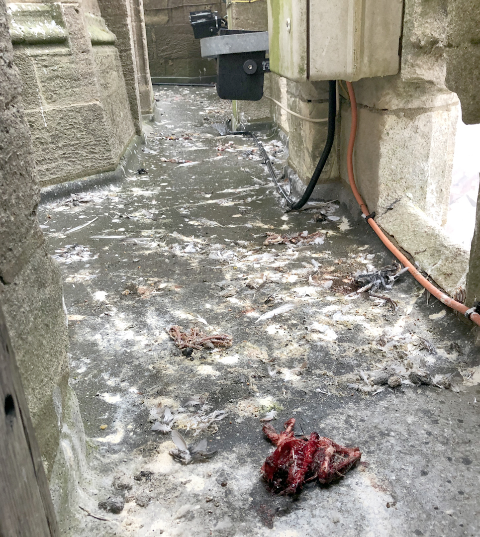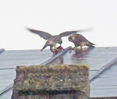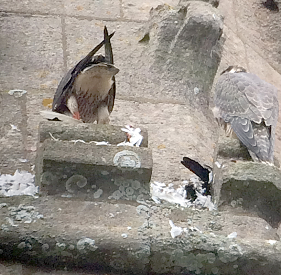 The peregrines have just attacked and killed a passing buzzard near the church this afternoon. The buzzard was quite high and minding its own business, but the peregrines were not taking any chances