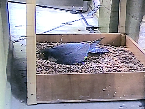 A quick check on the TV screen by Verger Dale Walker this afternoon revealed the falcon is now installed on the nest. She may have already laid, but with the weather being so cold, she wouldn't expose any eggs.