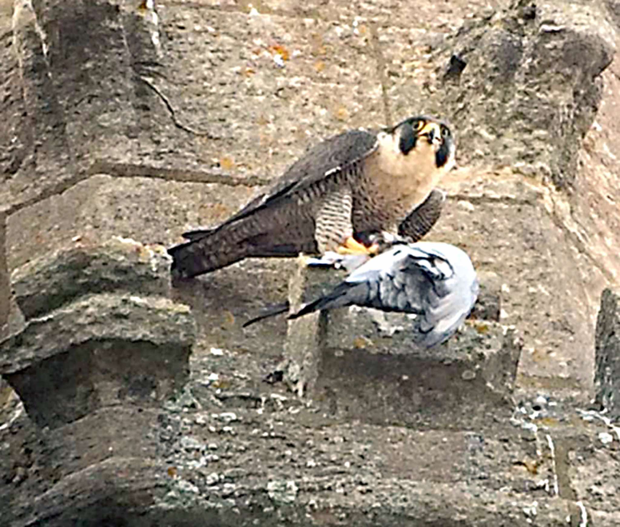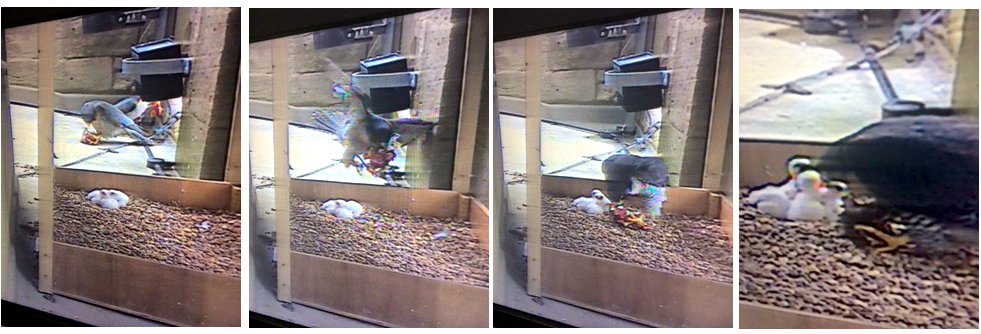 A rare sight of all five peregrines this morning. A juvenile (PSL) brought in prey that it shared with PTL, while at the same time, the adult falcon brought in another catch that was plucked round the corner. Regular food-passes are now seen.