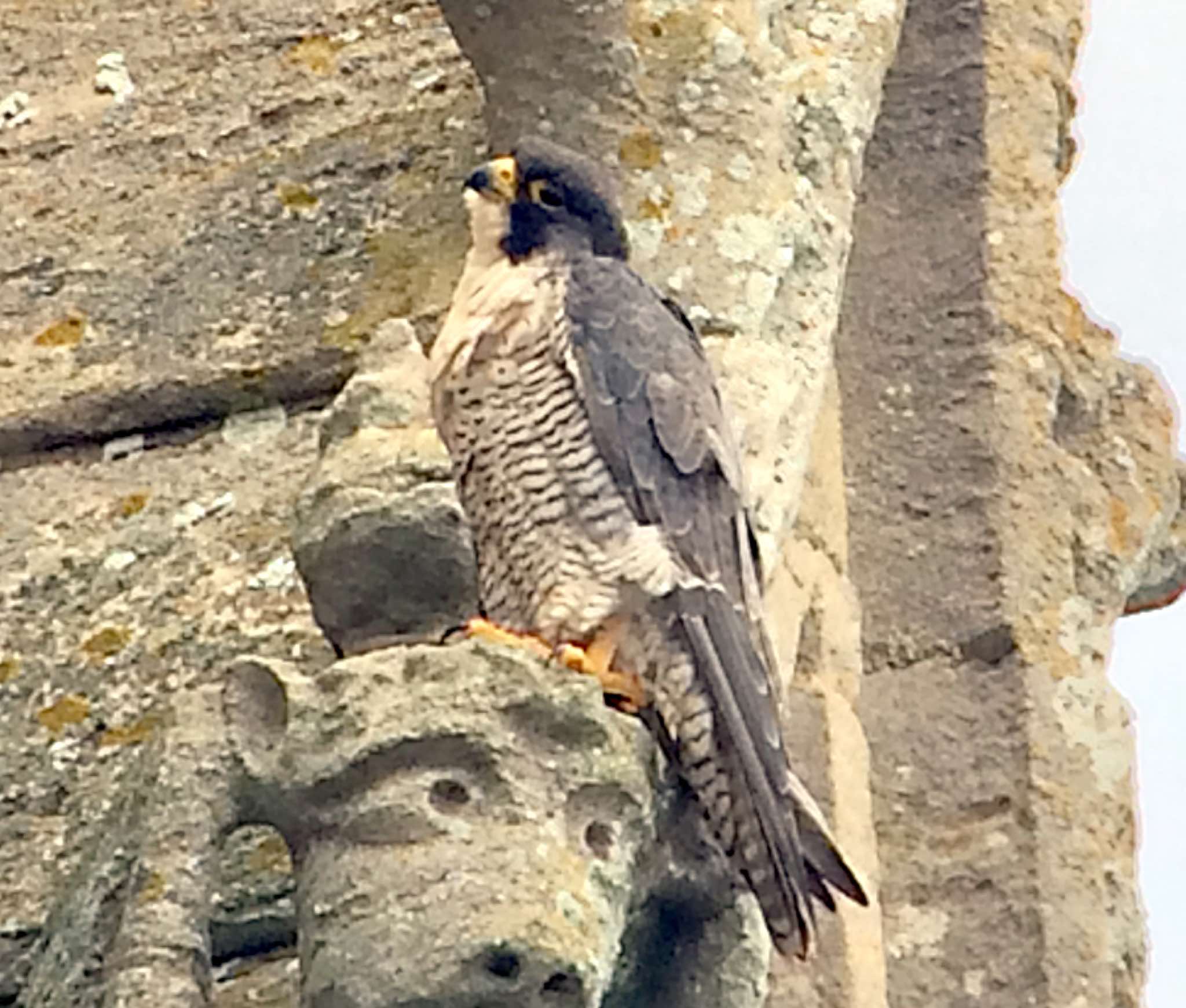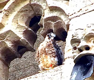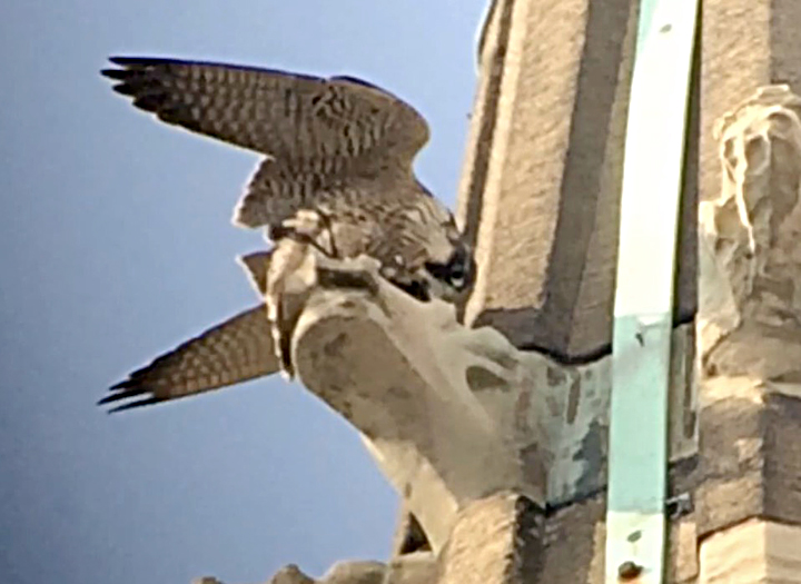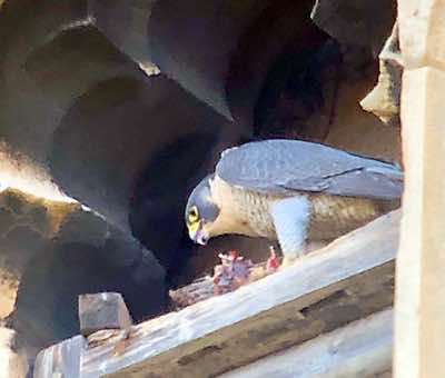 A rare sighting of both adults perched together on the east side of the tower. Quiet for much of the day now, with some calling by one, sometimes two juveniles early morning and late afternoon.