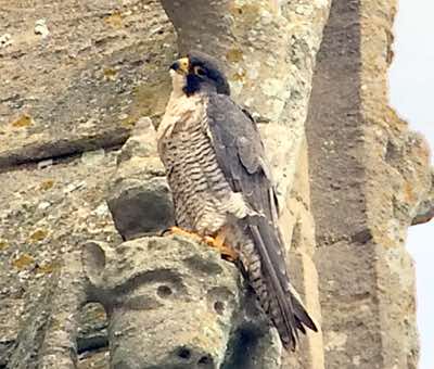 During a hot, sultry day, there was little activity, with juvenile (PTL) resting high on the spire and another juvenile on the north side of the tower in the shade. Around 15.00 PTL flew off, returning at 15.45 with prey – a wader. Around the same time I had a call saying that 'our' peregrines had been chasing prey over the saltmarsh at Rimac Nature Reserve. So, our juvenile made a 20-mile round trip, caught and returned with prey, in 45 minutes.