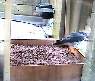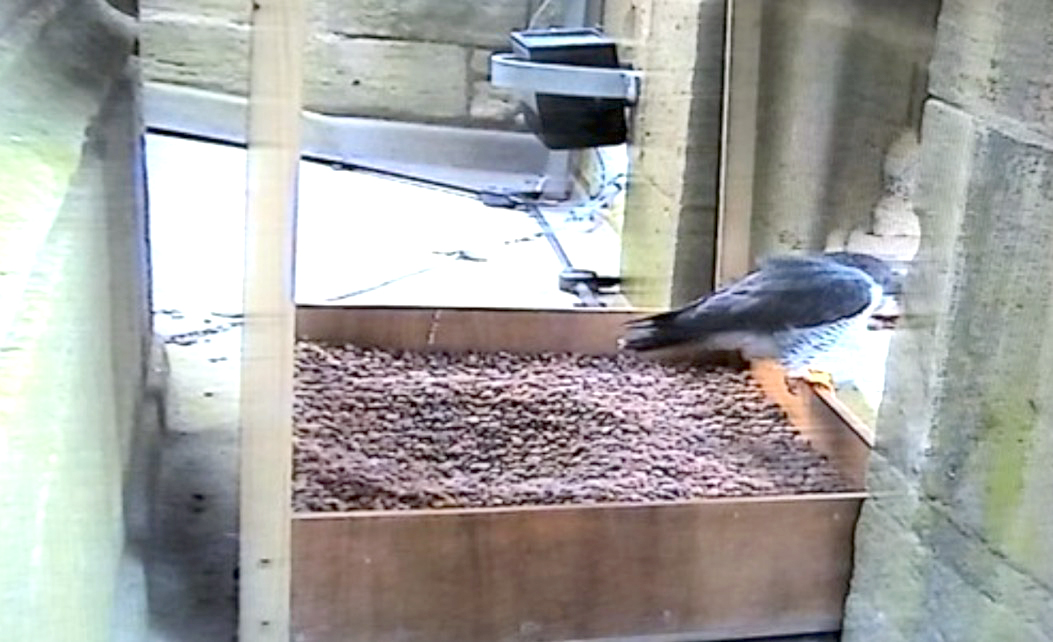 The tiercel was seen scratching around in the nest tray.