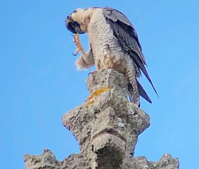 The falcon was photographed this morning enlarging the depression in the nest tray. Earlier, both birds flew after a sparrowhawk that was passing.