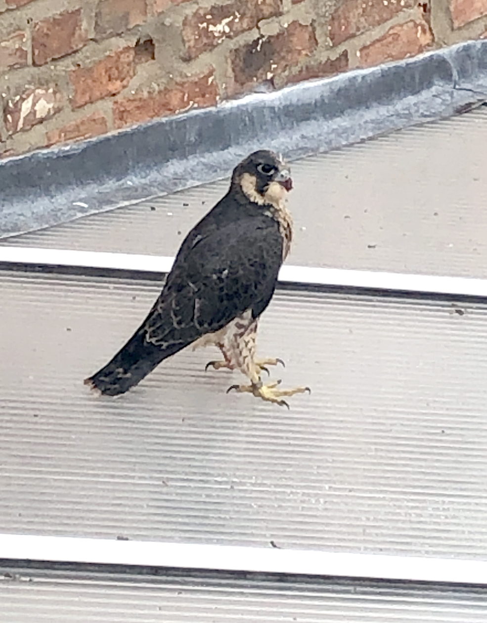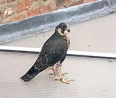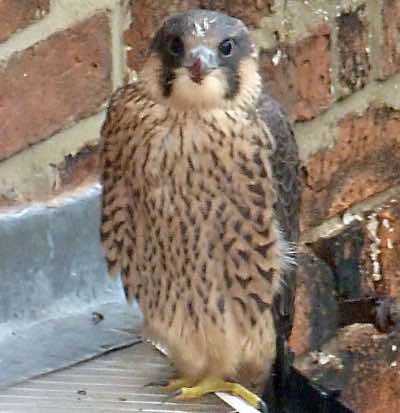 First flight this morning by one of the males (PTL). Conveniently landed on our garden shelter! I eventually caught it 3 hours later and took it to the church, only to discover another juvenile (the female PSL) had come down in the Rectory grounds last night and that had just been returned to the tower. Much shrieking by the adults.