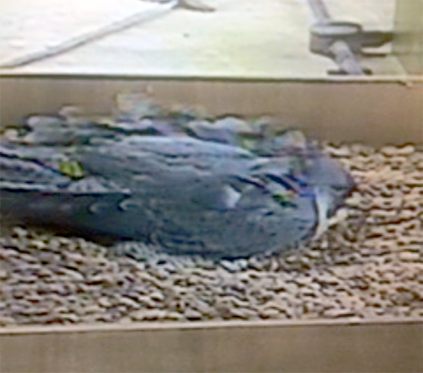 Dale was able to check the TV screen today, and saw the falcon brooding at least two, and possibly more eggs. The three birds were flying together briefly this morning, before the visitor flew off south.