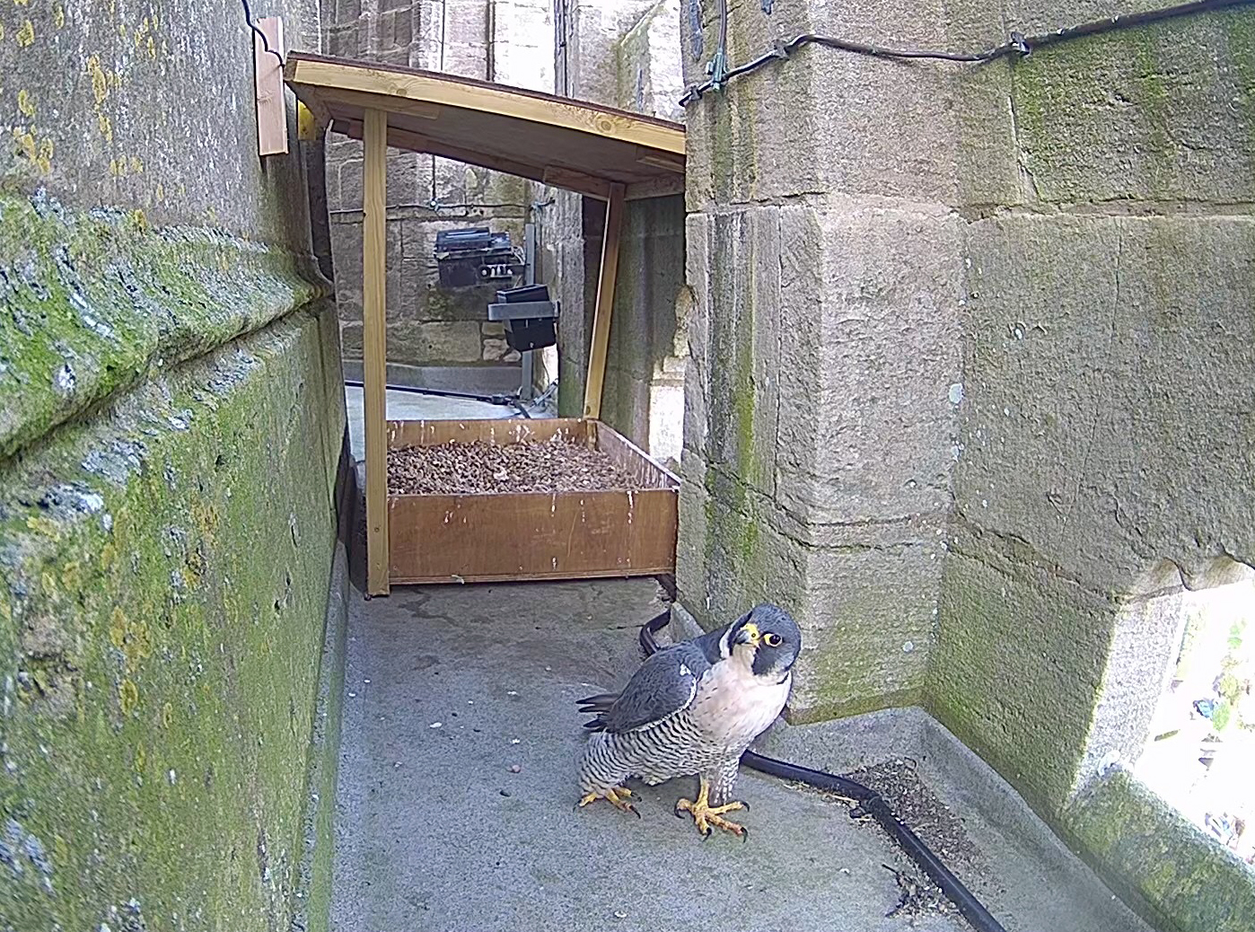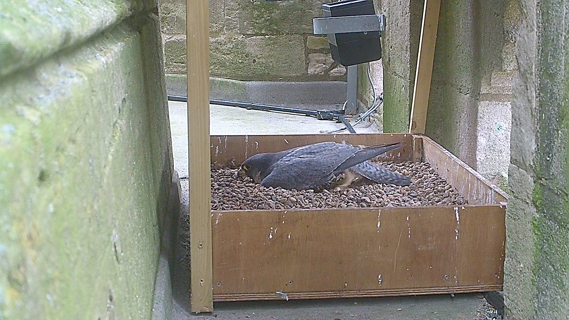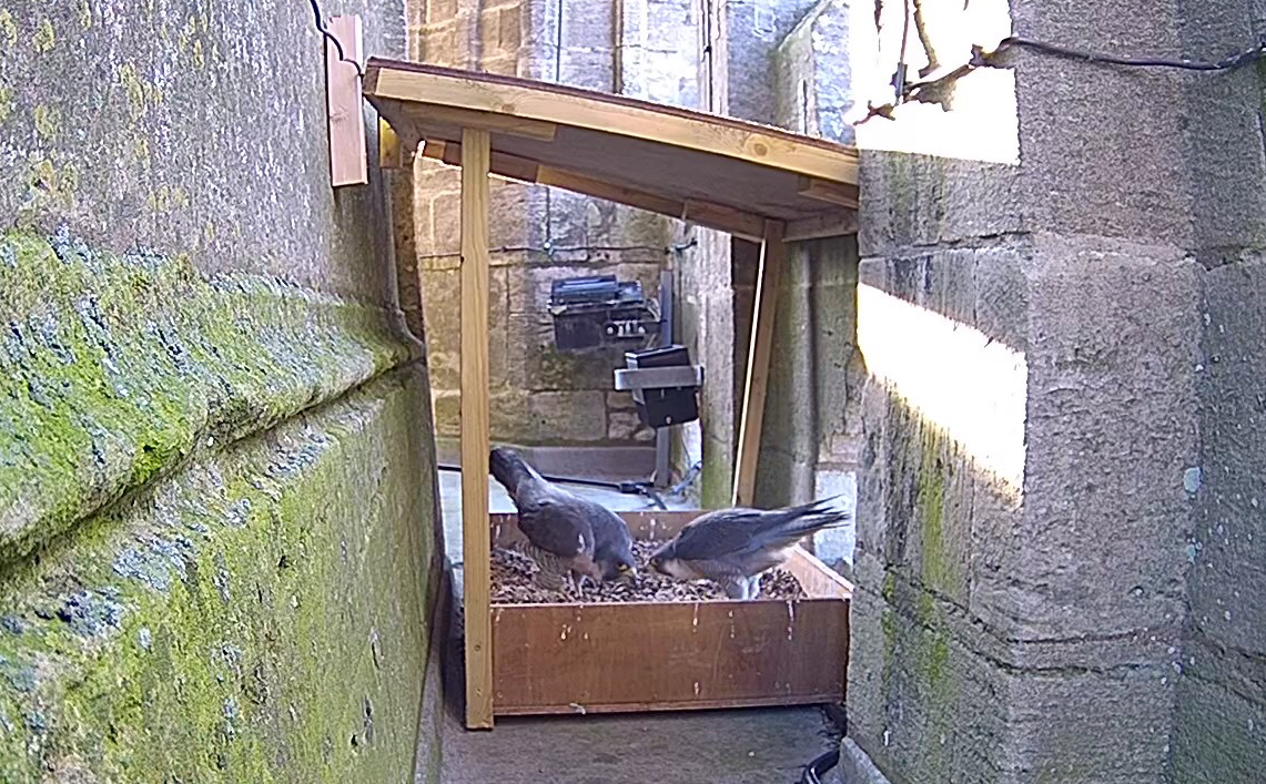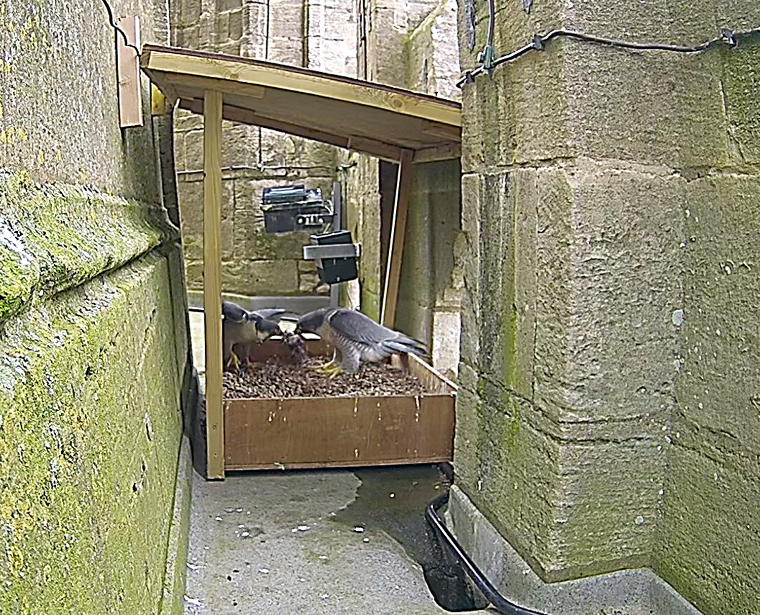 The female spent much of the time on the nest. The pair mated on the gargoyle in the afternoon and the male brought prey for the female.