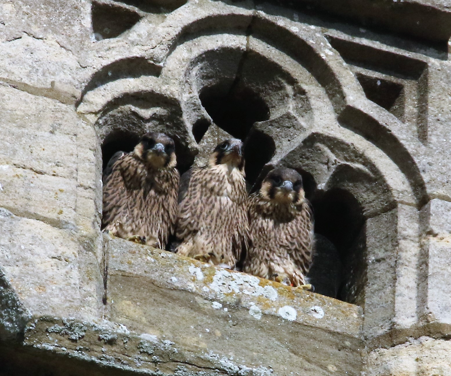 One of the juveniles (PXL) in the air this morning around 08.30 – currently sitting on the nave roof. A second (PBN) fledged later and is on the parapet beneath the bellchamber where it was fed by an adult at 17.40. It means photos like the one below, courtesy of Peter Taylor, won't be seen again this season.