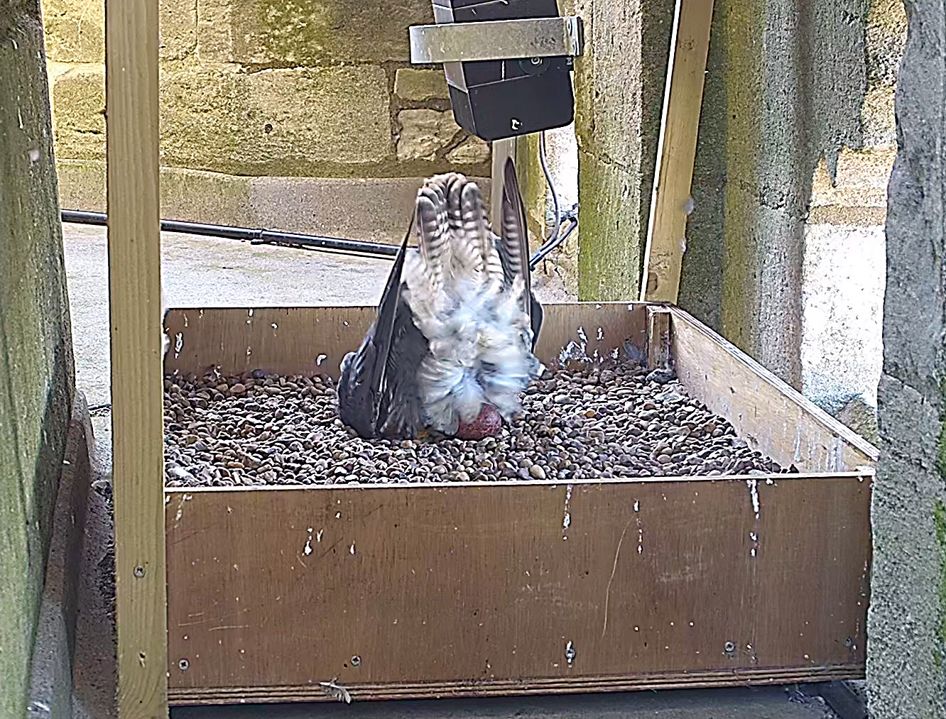 The egg was left unattended for 4 hours this afternoon, with both birds returning at 18.40. I'm told this is normal behaviour. An egg remains viable for days provided it doesn't get warm from incubation, as it hasn't started to form. The female won't usually incubate until the penultimate egg has appeared, ensuring the eggs hatch within a day or two of each other. Until then, when she's on the nest, she isn't incubating as her 'brood patch' isn't in contact with the egg. She's just sitting over it for protection.