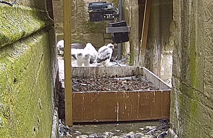 17.30 today. Three have now fledged, and are perched at various points around the tower. One is left alone, peerring through the castellations. It'll be a lonely night for her!