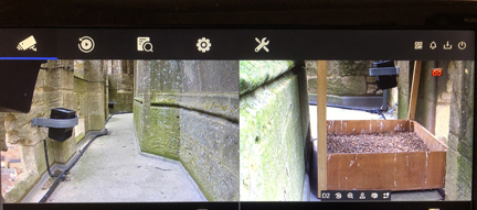 A busy (and breezy) morning on the church tower walkway. Chris Marshall and I installed the nest tray and camera for the TV screen in the coffee shop.
