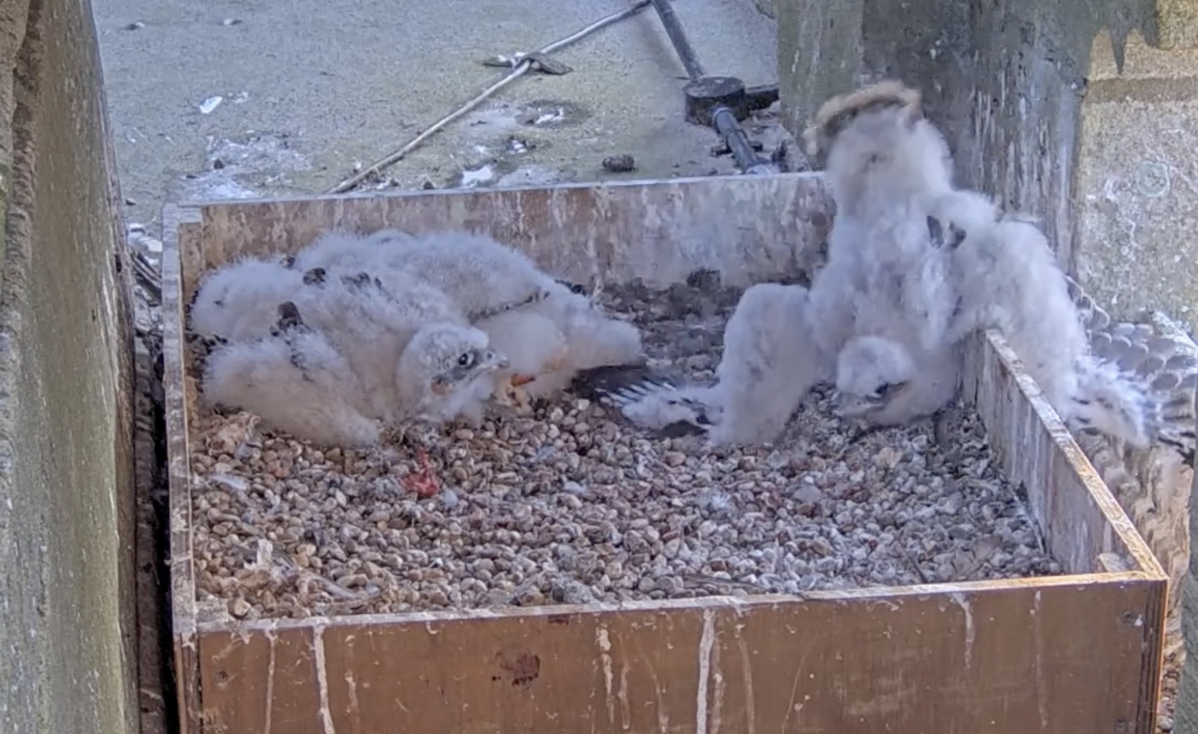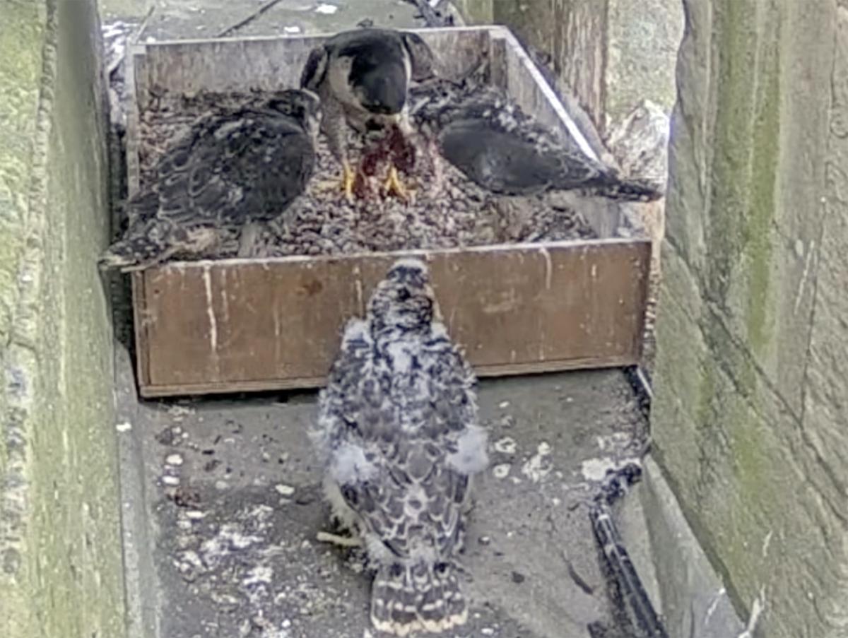 We would expect the chicks/juveniles to leave the nest tray in the coming week, so views on the live feed may be limited, but we have the west and east walkway cameras as a source of video clips.