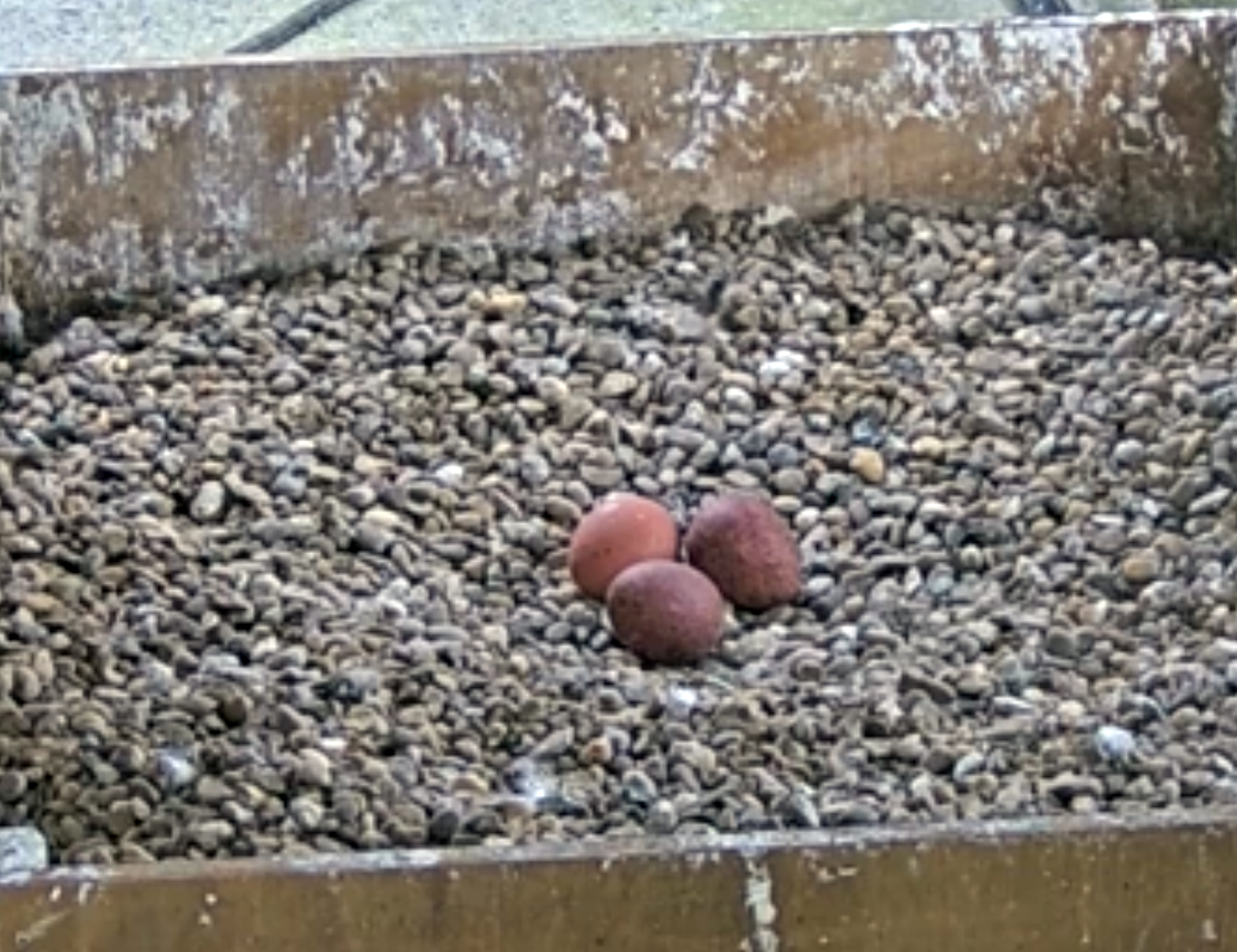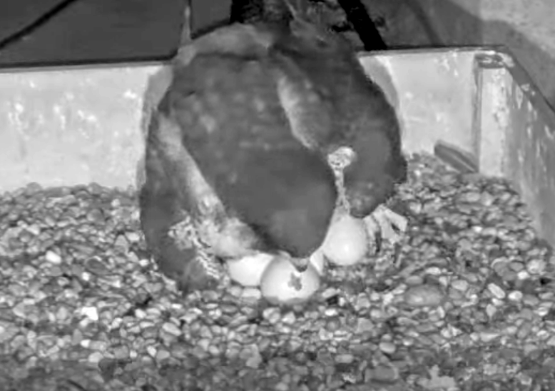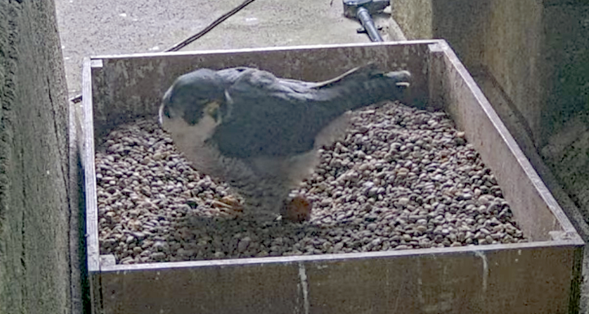 This short video shows the female on a pre-dawn visit to the nest. She is eating gravel – peregrines, like other raptors, swallow small bits of gravel/grit that act as 'teeth' in the gizzard, breaking down food and thus helping digestion. These stones are called gizzard stones or gastroliths and usually become round and smooth from the polishing action in the bird's stomach over time. When too smooth to do the required work, they may be excreted or regurgitated. The bird then finds and swallows some more rough grit.