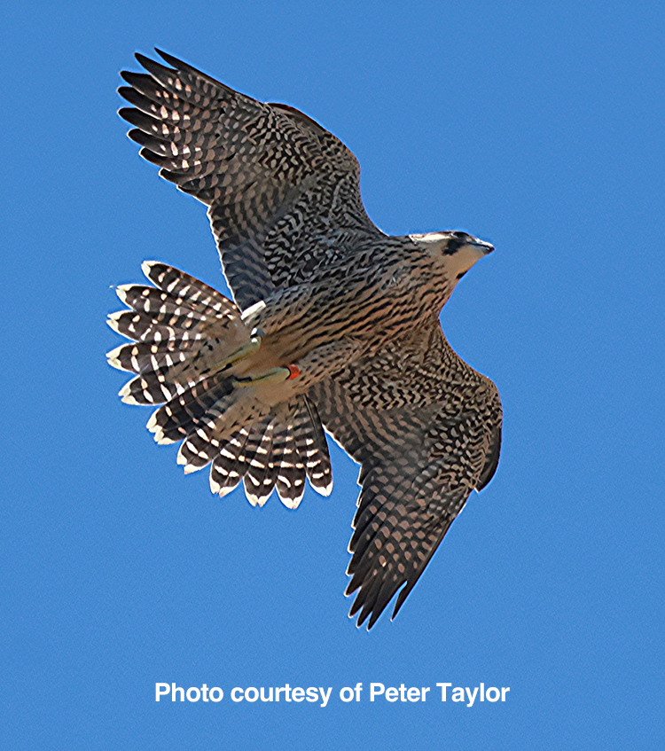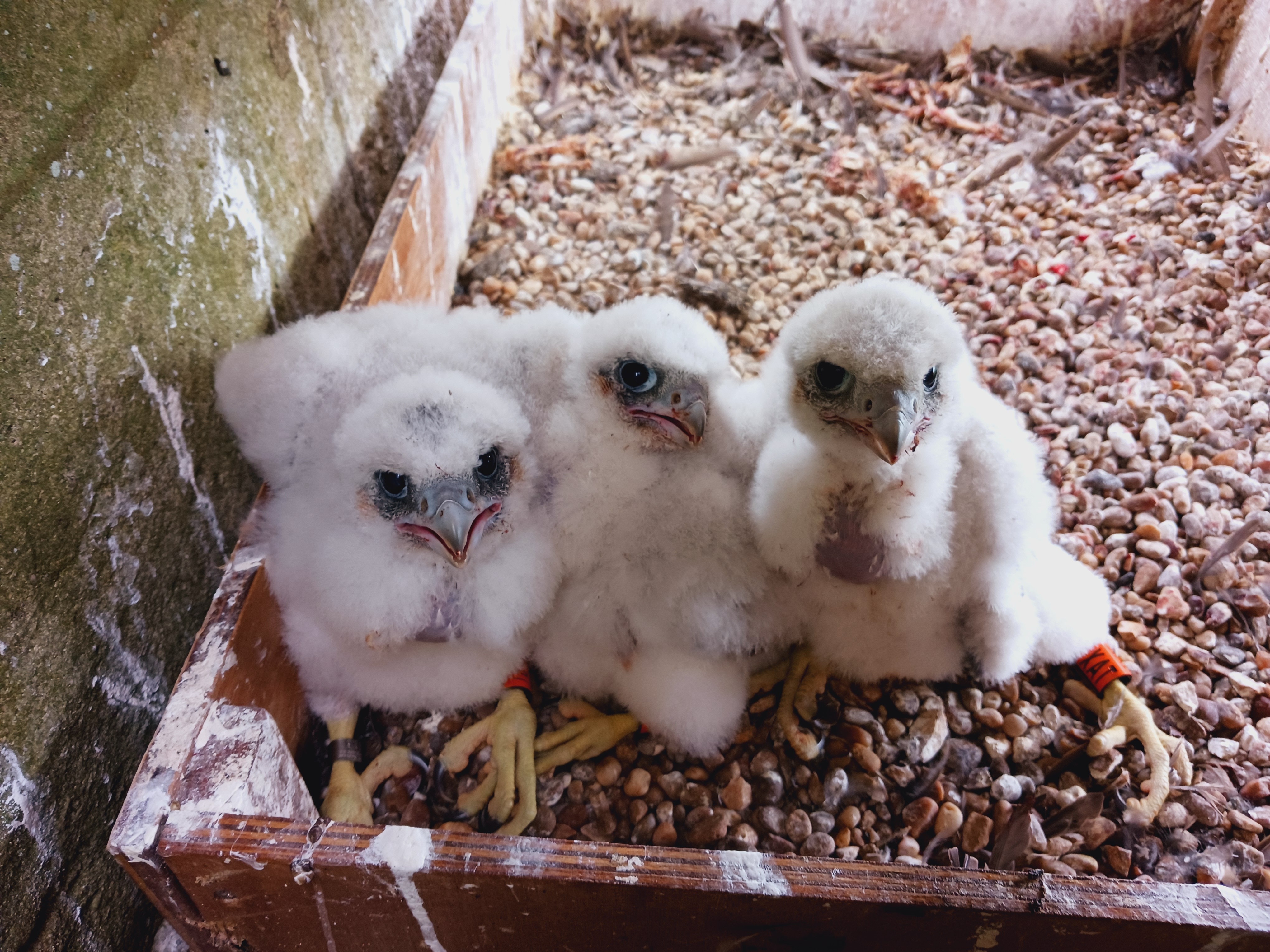 The first of our juveniles, X7T successfully fledged early this morning and is currently resting on the nave roof. Photo from our bedroom window. Subsequently seen to be flying strongly, it eventually landed on the lower walkway, east side, where prey was brought in for it.