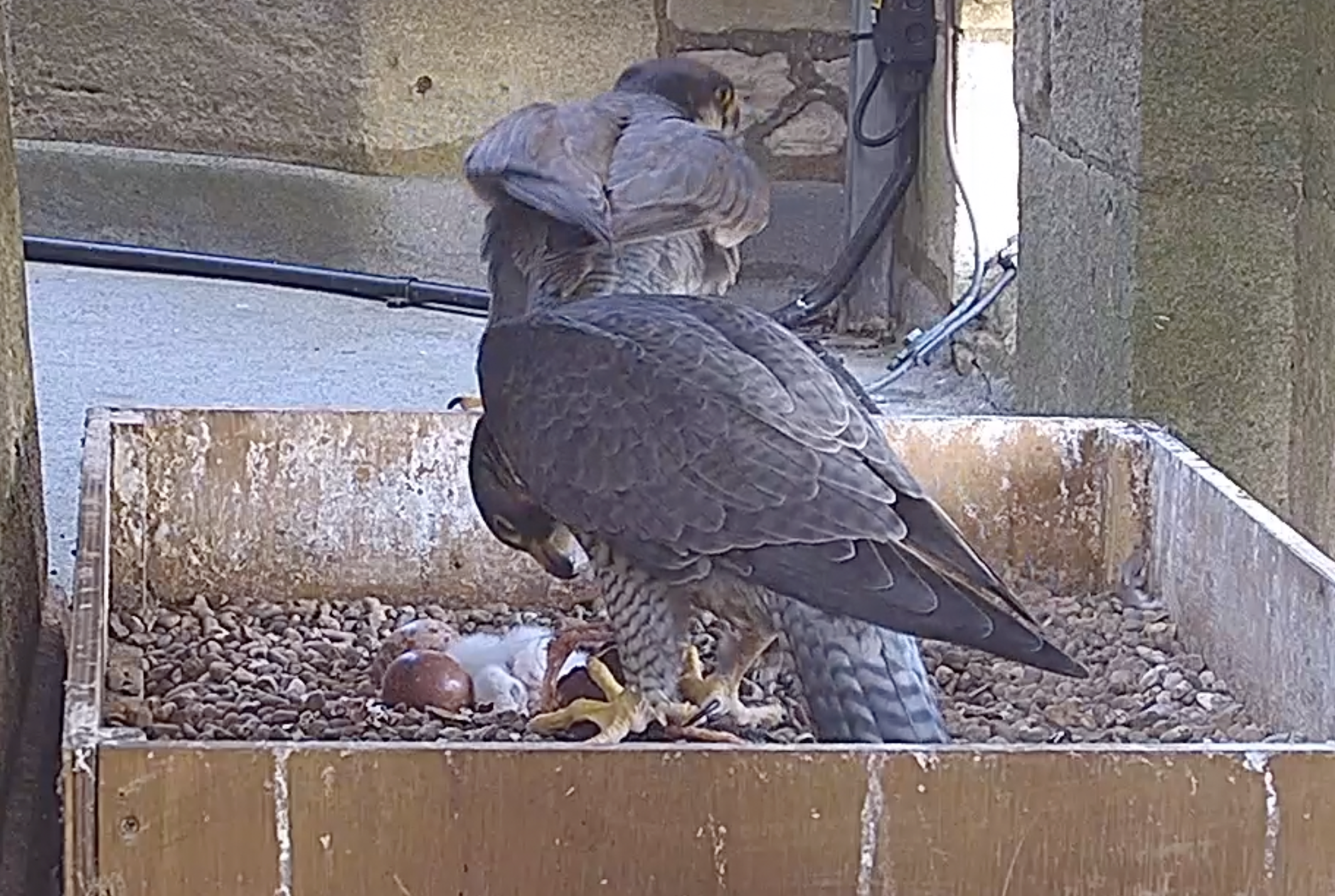 The pair mated several times yesterday on the gargoyles on the north side of the tower. Last night, the female came on the nest at 23.45 and slept until 05.30. After a break, she returned at 08.20, departing with the male at 09.30.
