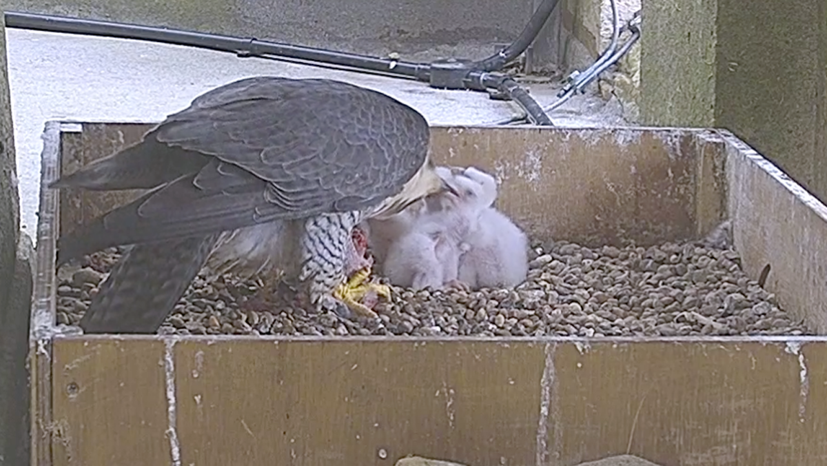 Feeds recently are averaging 7 per day, beginning around 05.00, with the last one 19.00. Mostly small prey with some of it cached for later use. All four chicks seem to be doing well, depite the cold wind.