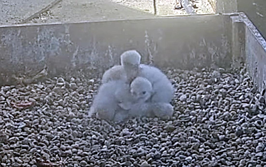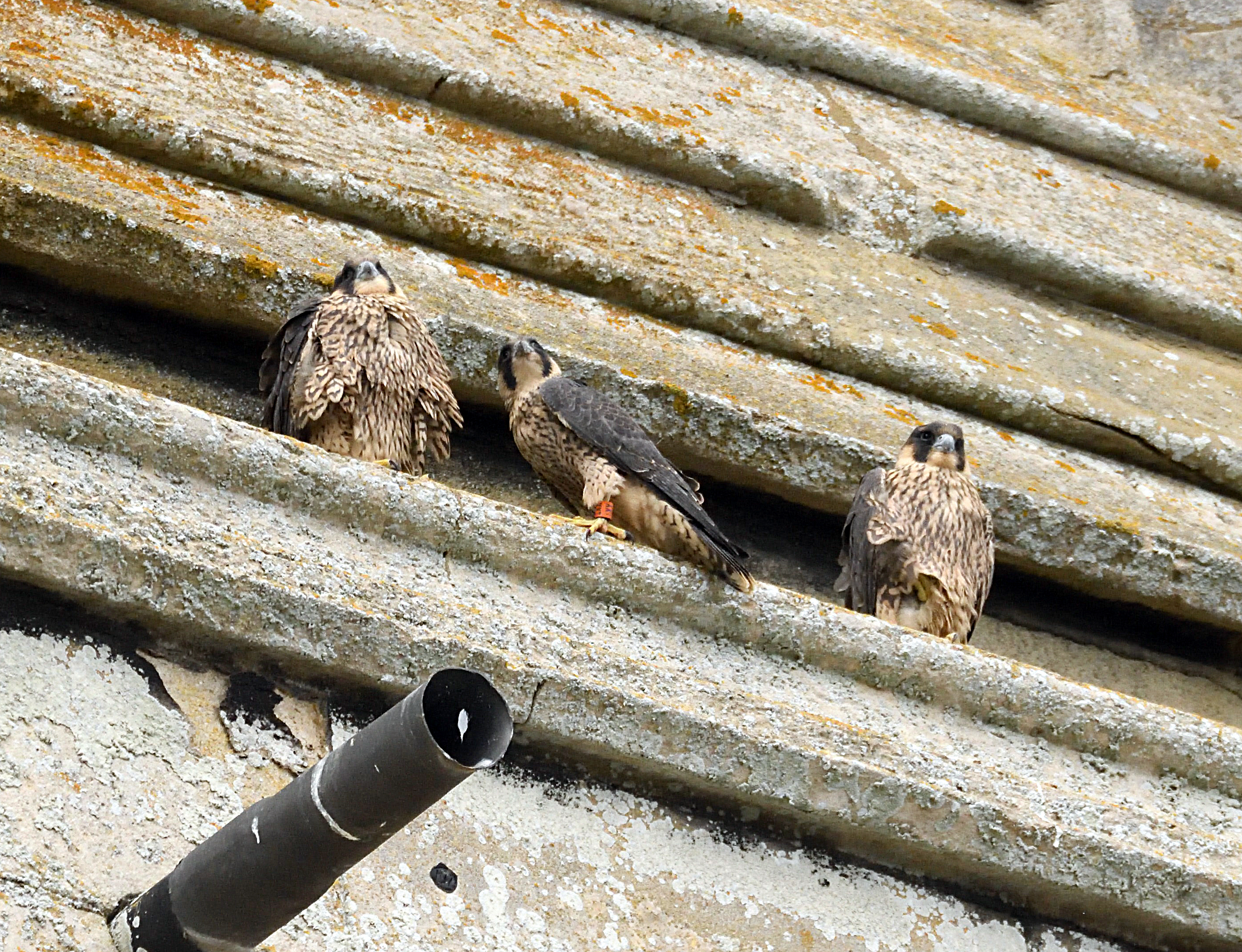 First to fledge? Looks likely (XTT) Two juveniles slept in the nest overnight and at first light, an adult was seen to fly to a gargoyle on the north side where a juvenile was already in place. The video implies there was food brought in and left, but there's no record of either birds leaving. The juveniles are very mobile now, but all three were recorded at the same time on various walkways at 09.12