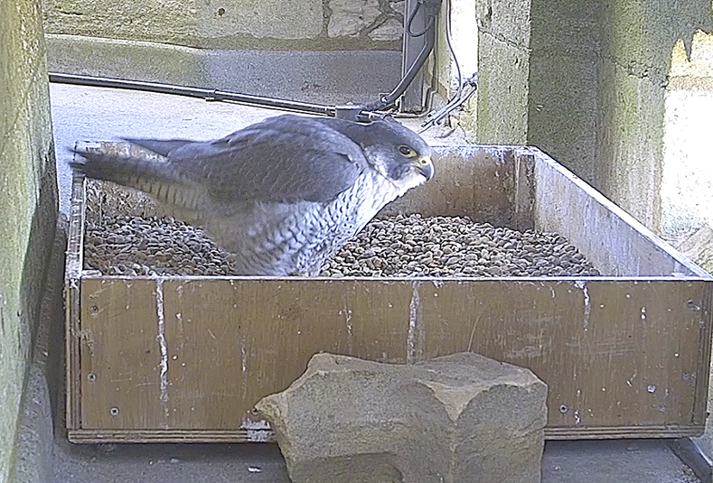 The male poked his head through the crenellations at 7am this morning. Presumably checking the nest is still in place!