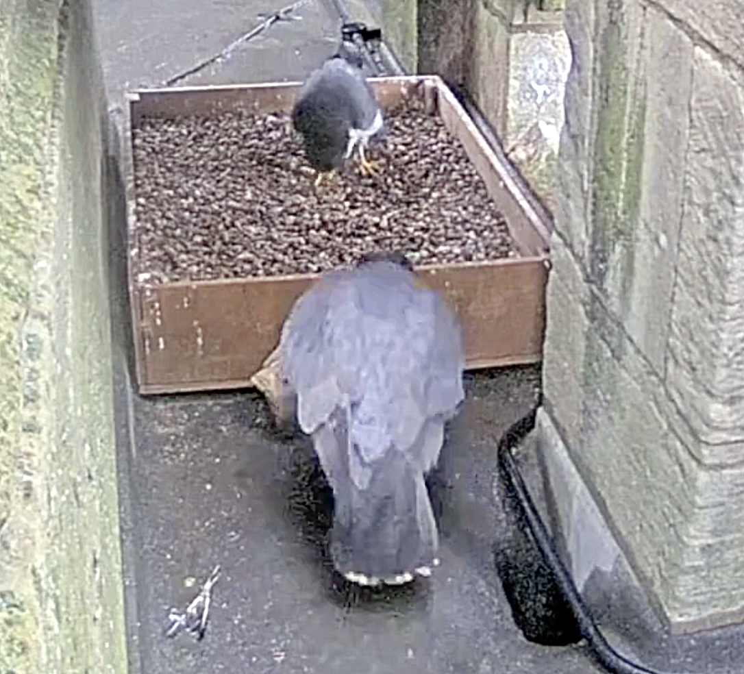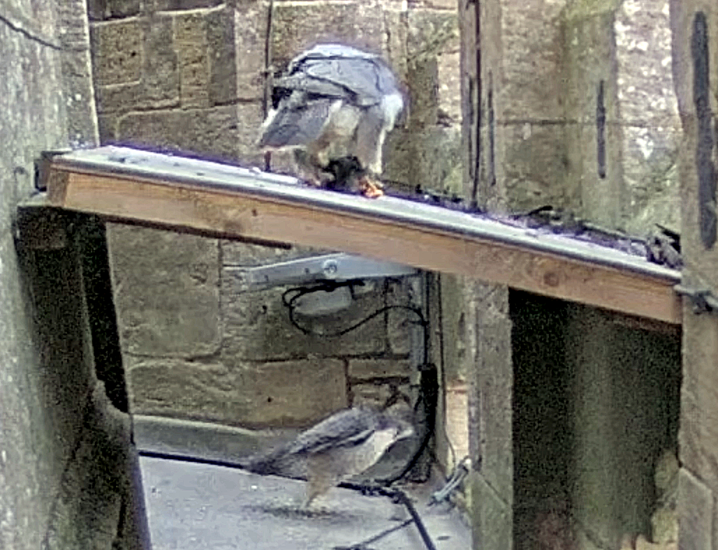 The visiting male has been around all day and currently (13.25) sitting on the spire crockets. At 06.25 this morning, he brought in prey to the nest roof and ate while our female looked on.