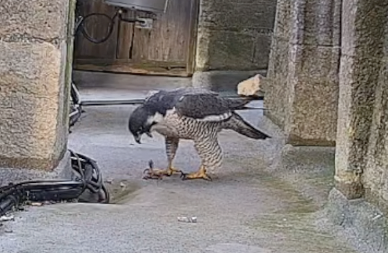 The benefit of multiple cameras around the church tower walkway. This YouTube video (click image for the link) shows the male bringing in prey, which is taken by the female to the west walkway where she regurgitates items, before moving around to thesouth, then east walkway, from where she flies.