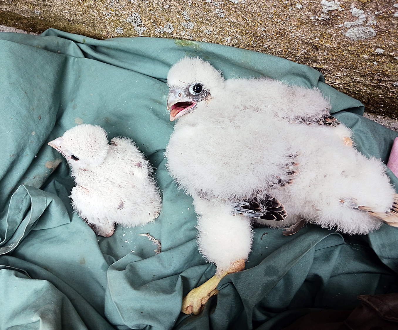 No. Times are rarely hard for two adult peregrines that are able to hunt for food. Unlike barn owls that spread out their egg-laying and hatching times so as to allow the first-born to predate the younger chick in times of food scarcity, the peregrine times the hatchings so all chicks arrive within a day or two. All are fed, and certainly in Louth, all have developed into juveniles. In 2023, there was a runt that hatched 54 hours after the previous (3rd) hatching. It was so small, it couldn’t be ringed, yet over time it developed to full size and eventually fledged. The picture below gives a comparison of their size at the time of ringing.