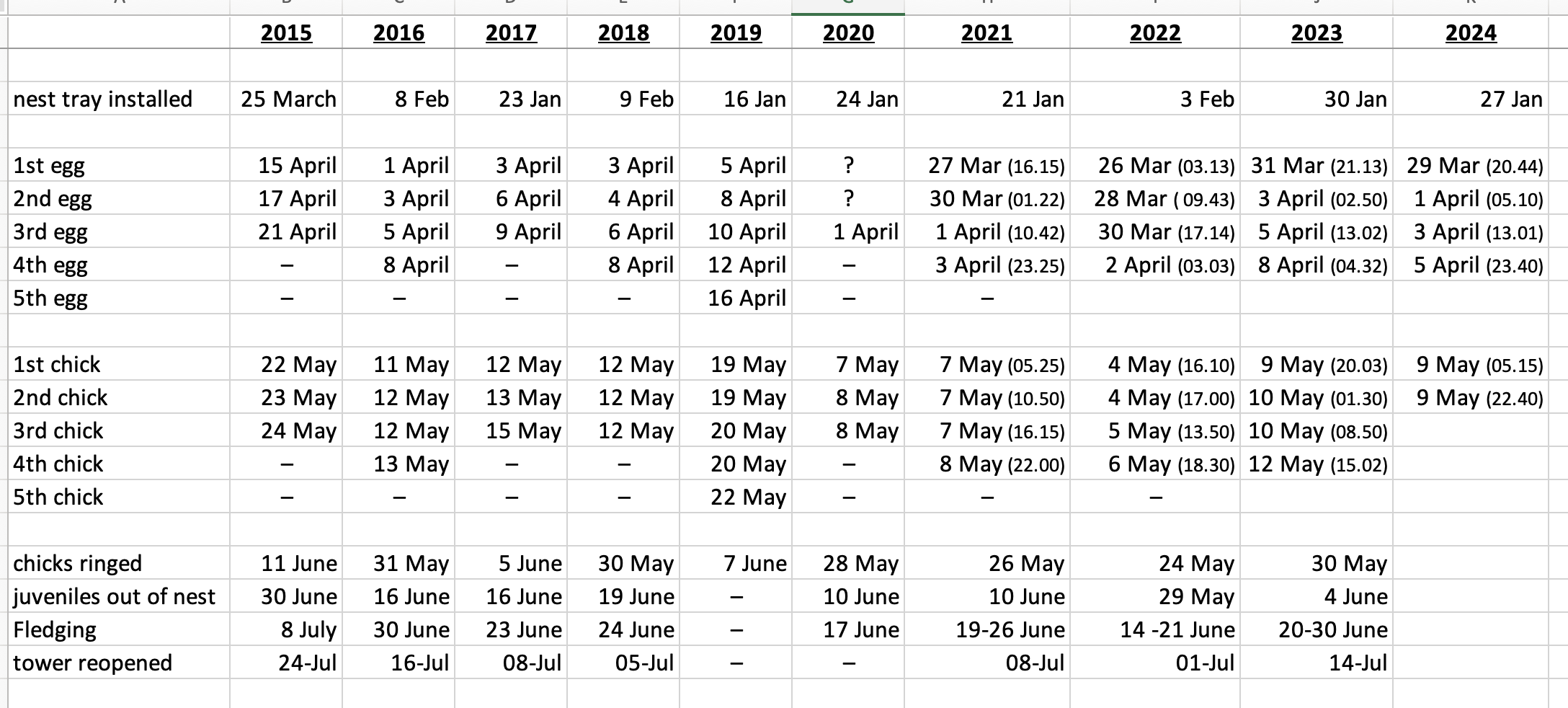 Year on year, the time span for the development of the eggs, hatching and fledging are surprisingly regular. You can download the dates from 2015.